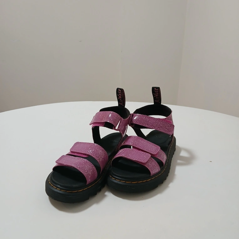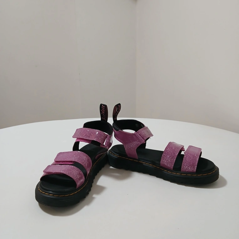 Pink glitter sandals. Three straps. Black platform sole. Good condition. Slight wear./ with box