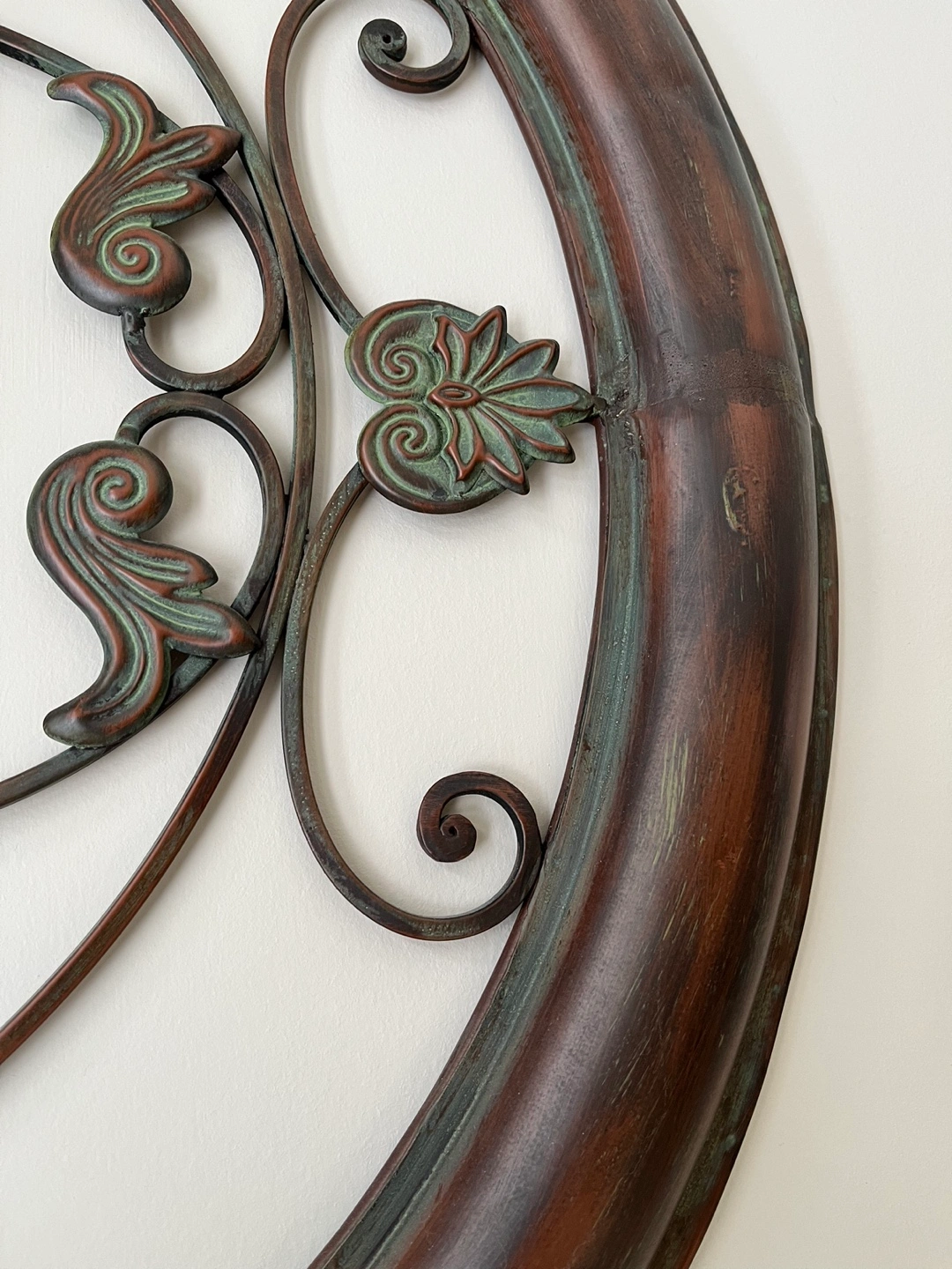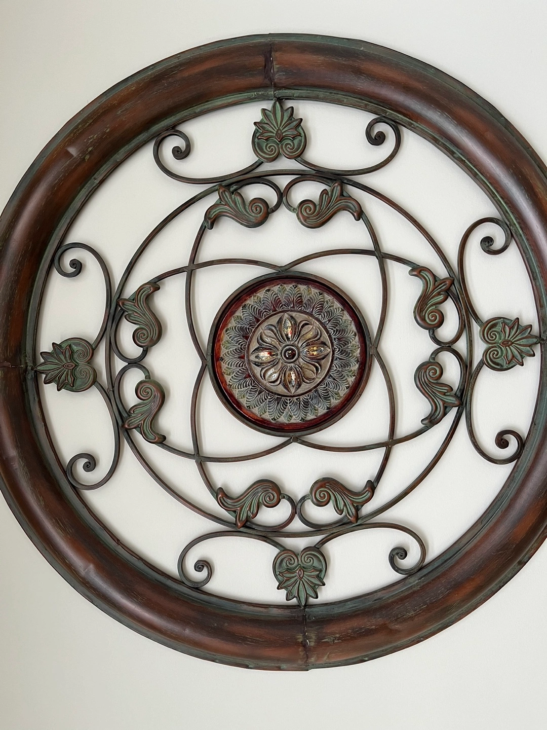 Beautiful round wall hanging. Features an intricate metal frame with decorative accents. Central medallion with embossed details. Adds elegance to any room.