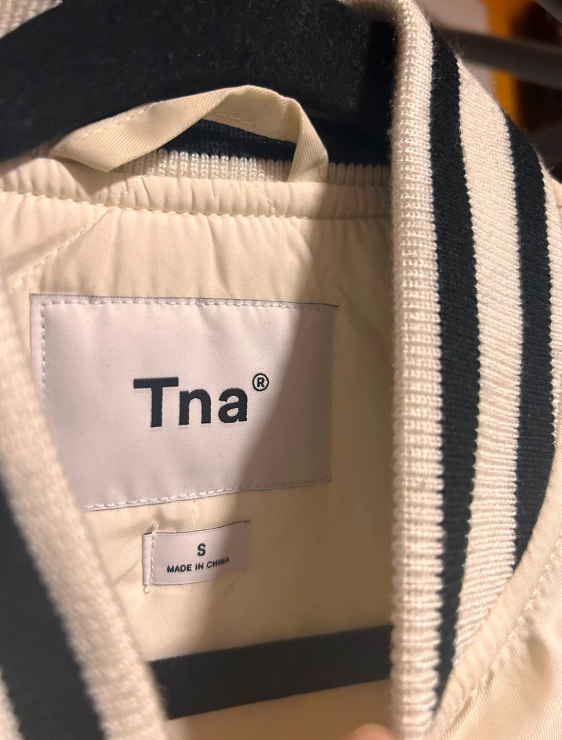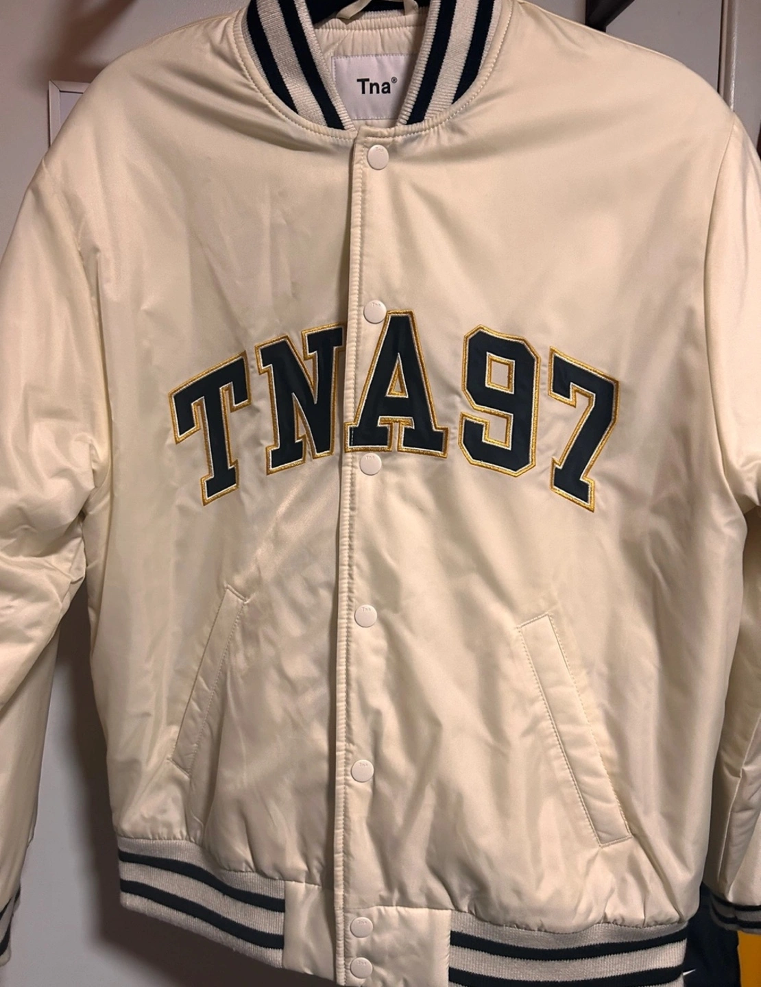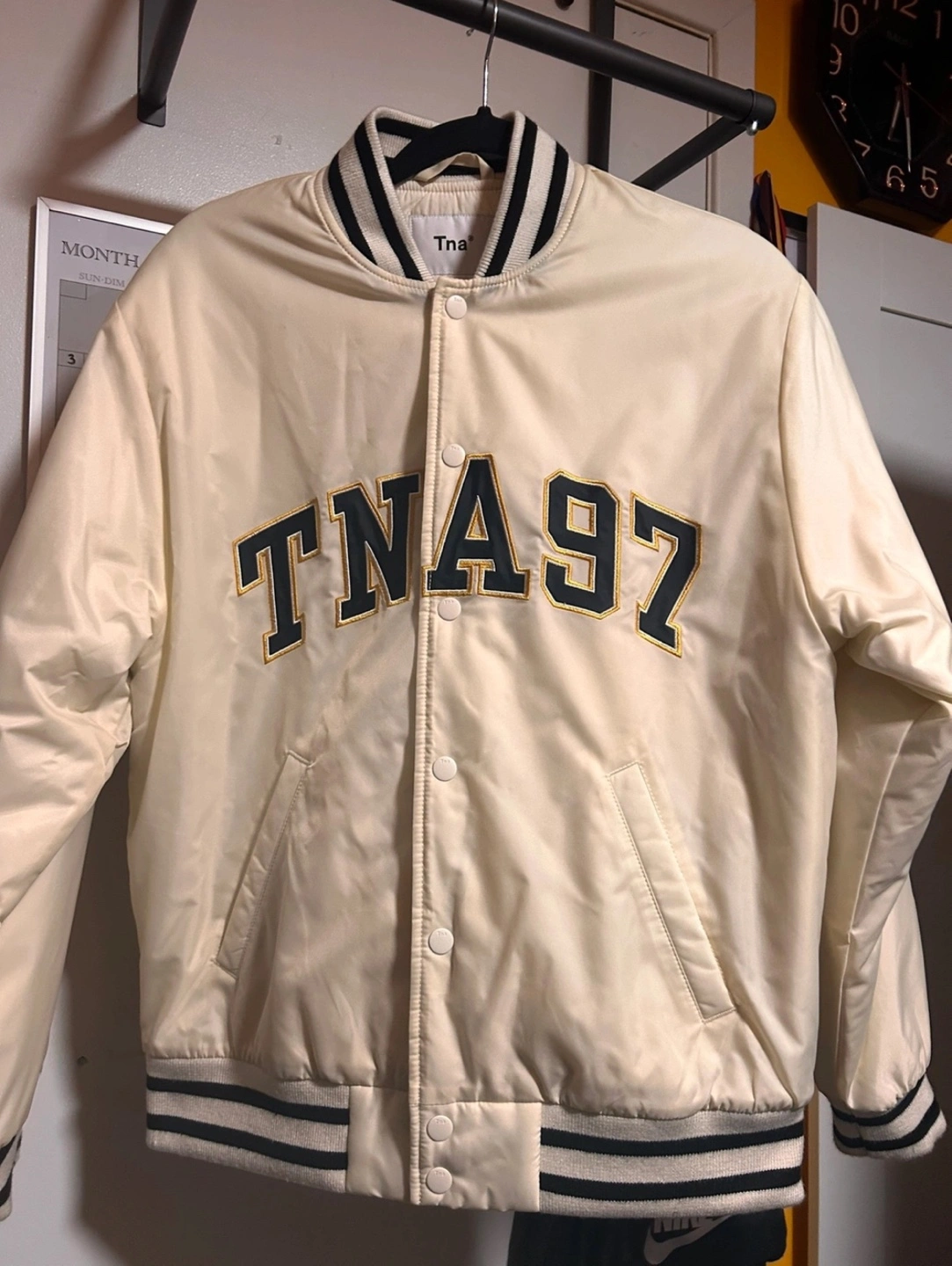196Cream-coloured satin varsity jacket. Features black and white ribbed cuffs and collar. TNA97 embroidered on the front. Size small. Pre-loved clothing, clearing out my closet:( - purchase 3+ or more items from my listing to get a discount on a bundle! --> open to trades as well for the same amount!