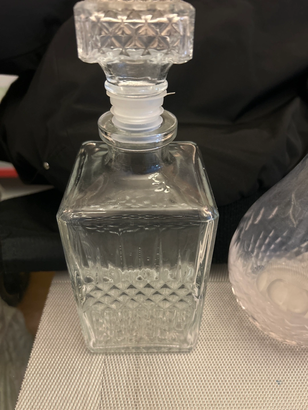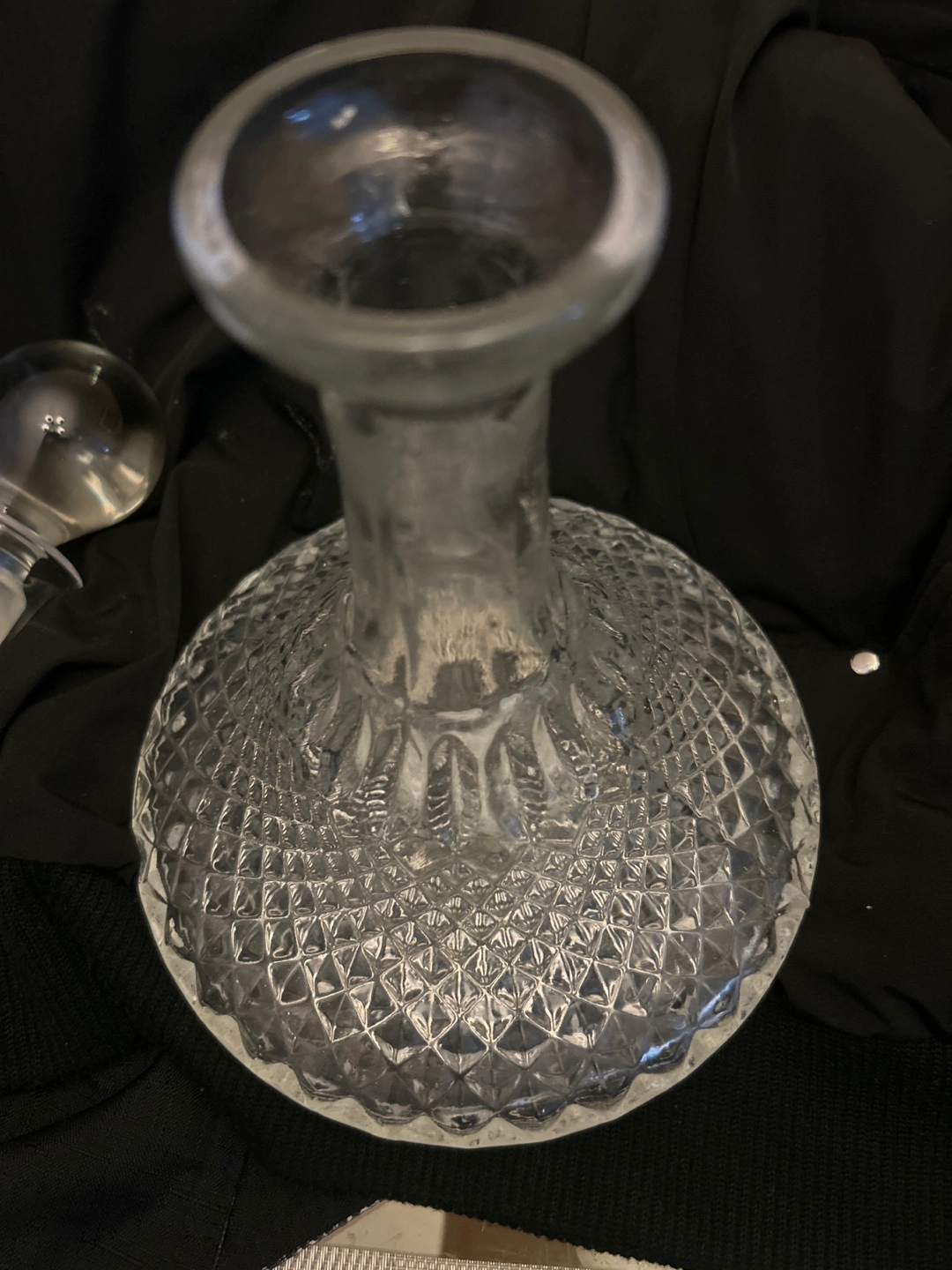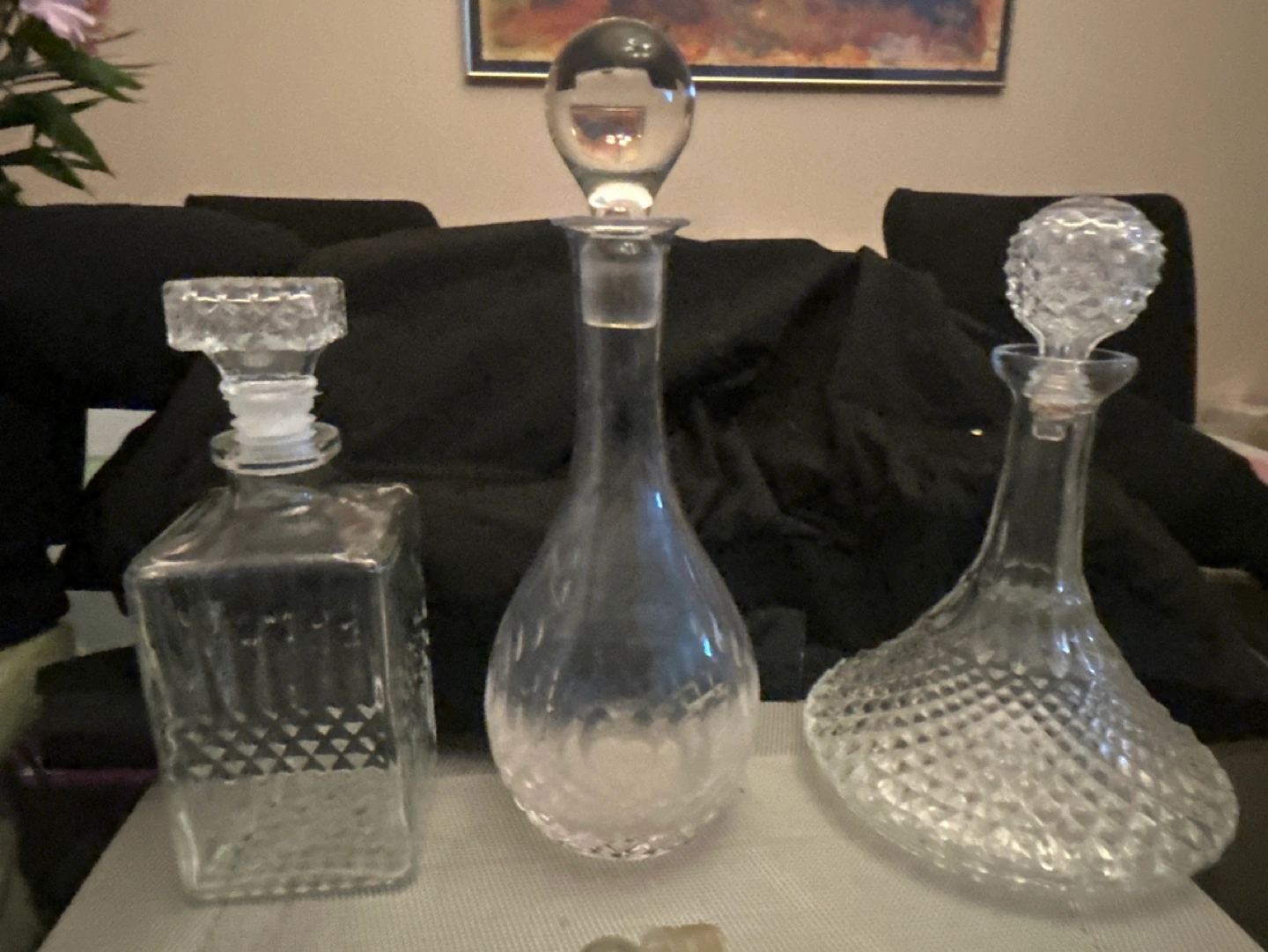 Three vintage glass decanters. Diamond pattern. Stoppers included. Whiskey bottle and 2 wine carafes can be used as decorative pieces.