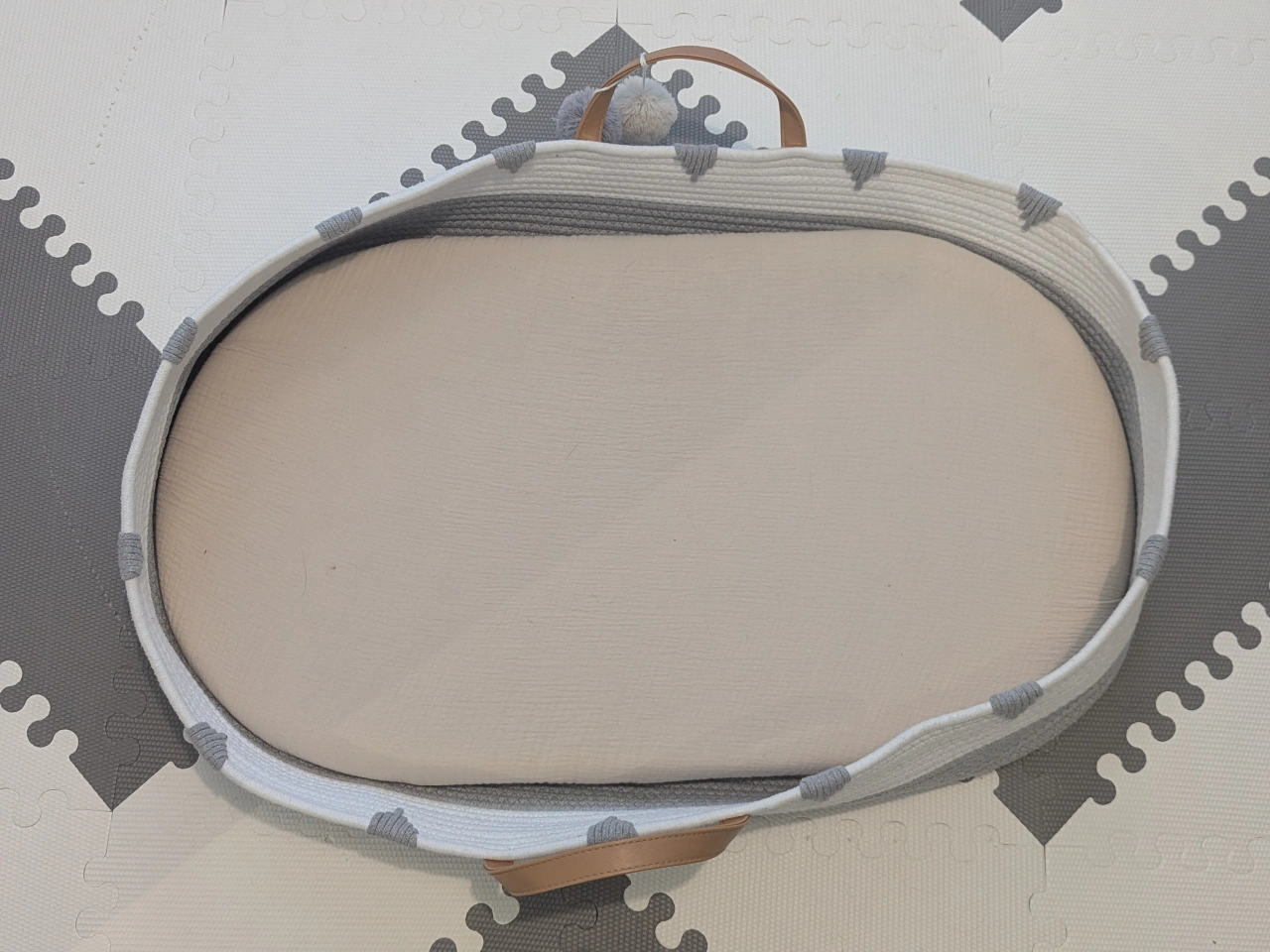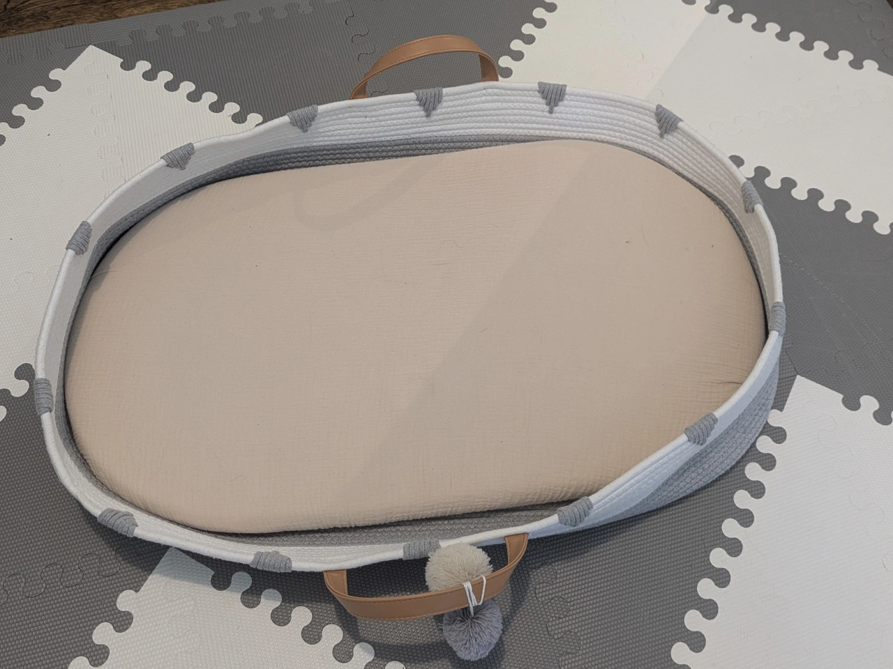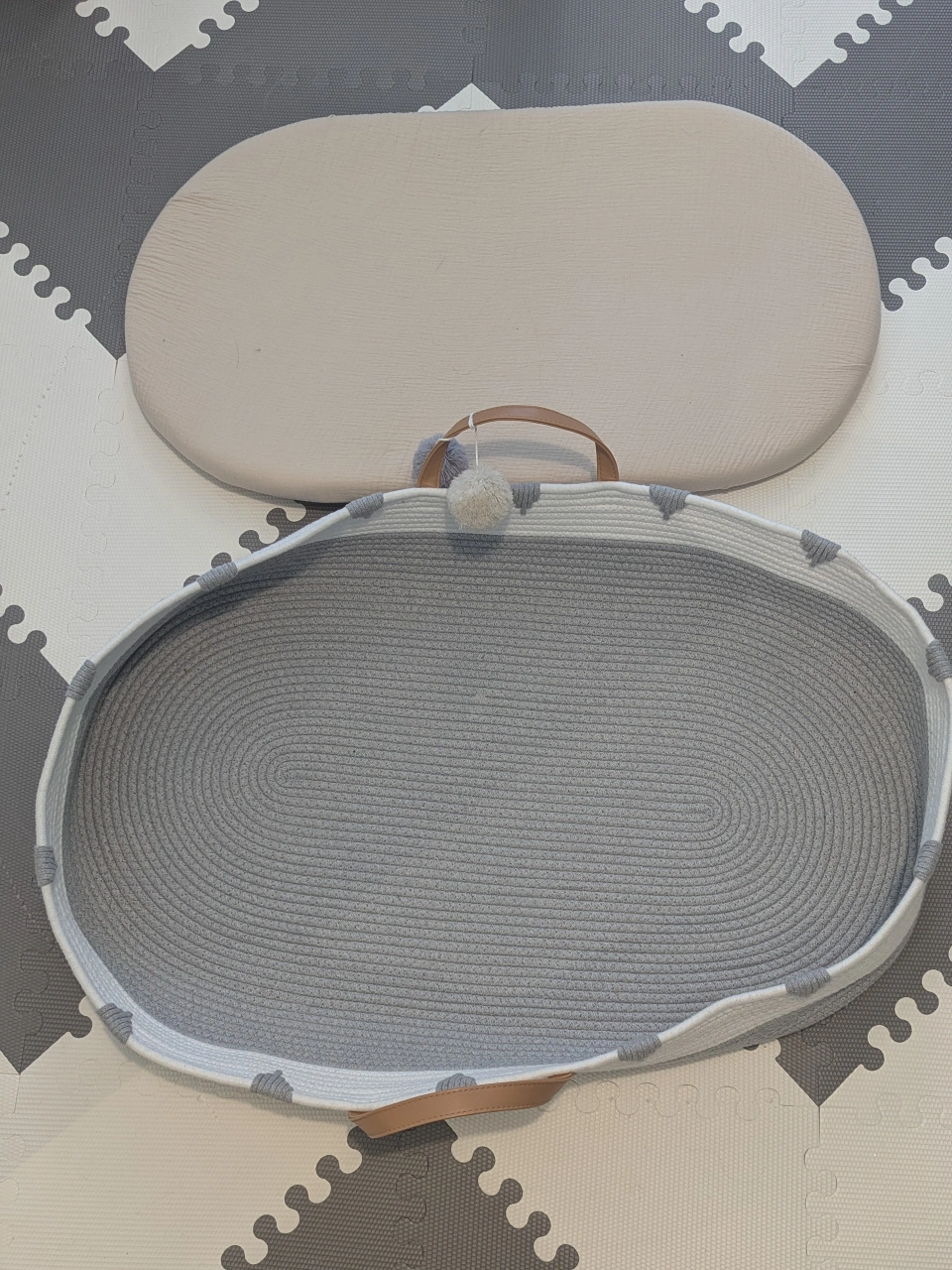 Grey and white woven changing basket. Oval shape. Includes a beige foam pad with sheet. Portable. Perfect for newborns.