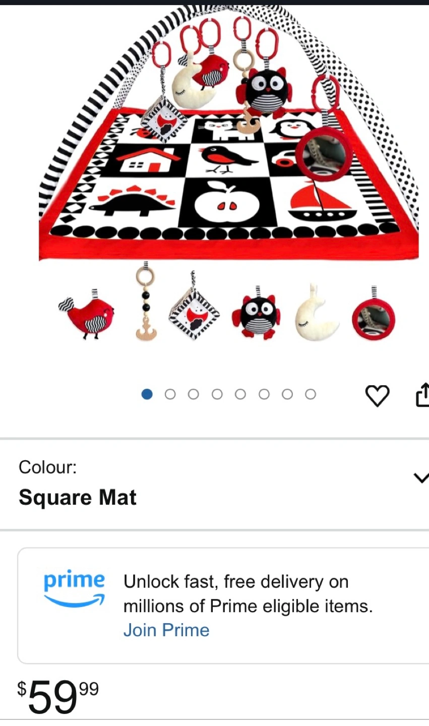 Adorable baby playmat, black and red design. Includes hanging toys. Great for tummy time and playtime. New, still in packaging.