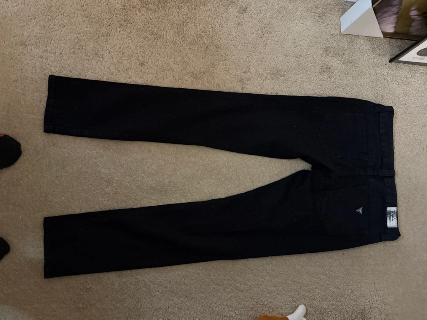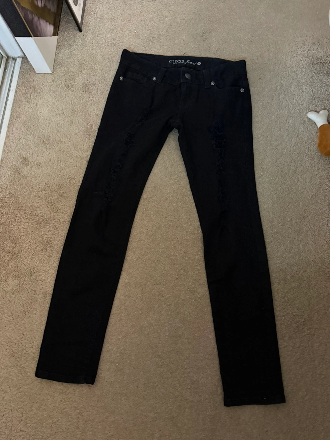 Black skinny jeans. Distressed detailing on both legs. Classic Guess branding. Vintage y2k