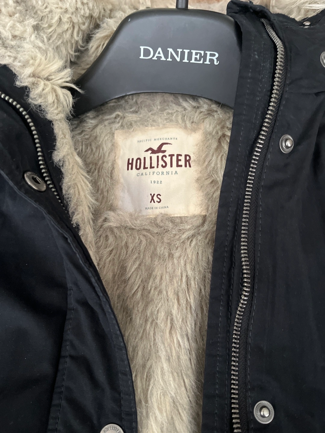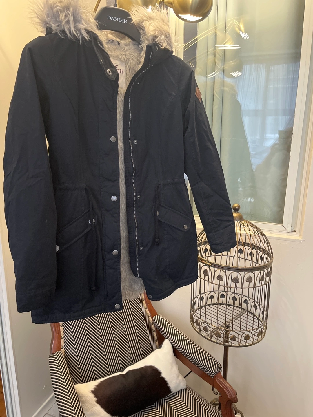 Women's black parka. Size XS. Features a faux fur-lined hood. Zip and button closure. Drawstring waist. Excellent condition.
