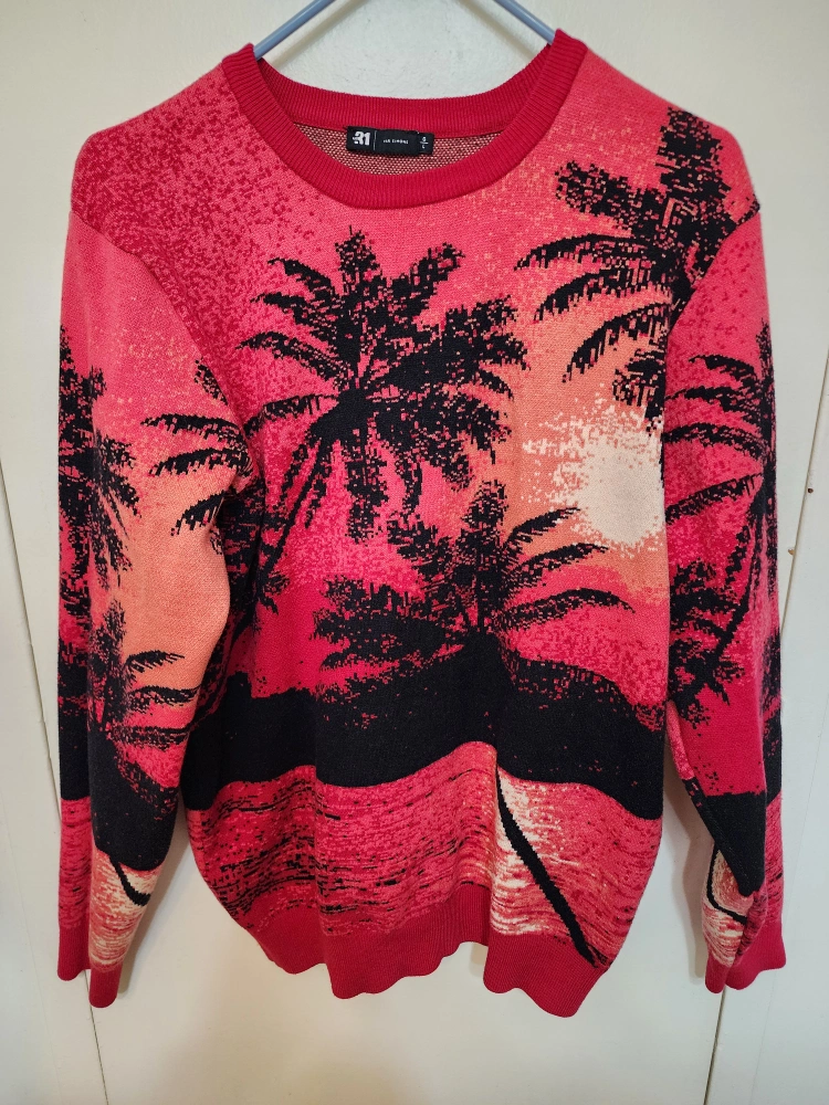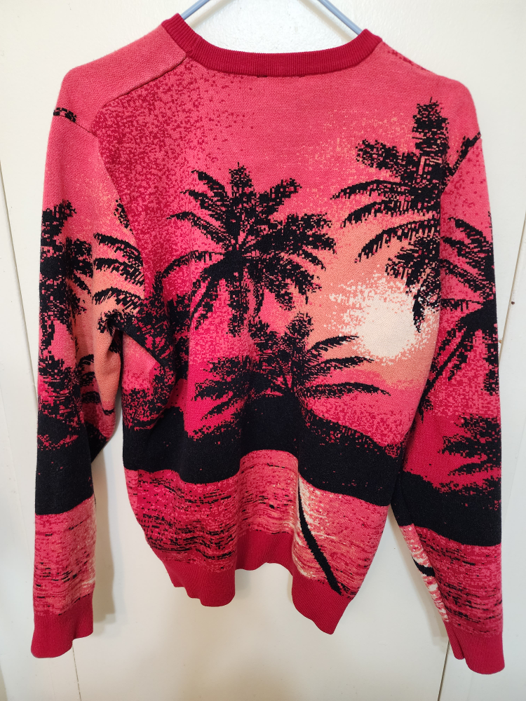 Used Crew neck long sleeve sweater. Features a sunset and palm tree design. Red, orange, black and white colours. Looks great with jeans or chinos.