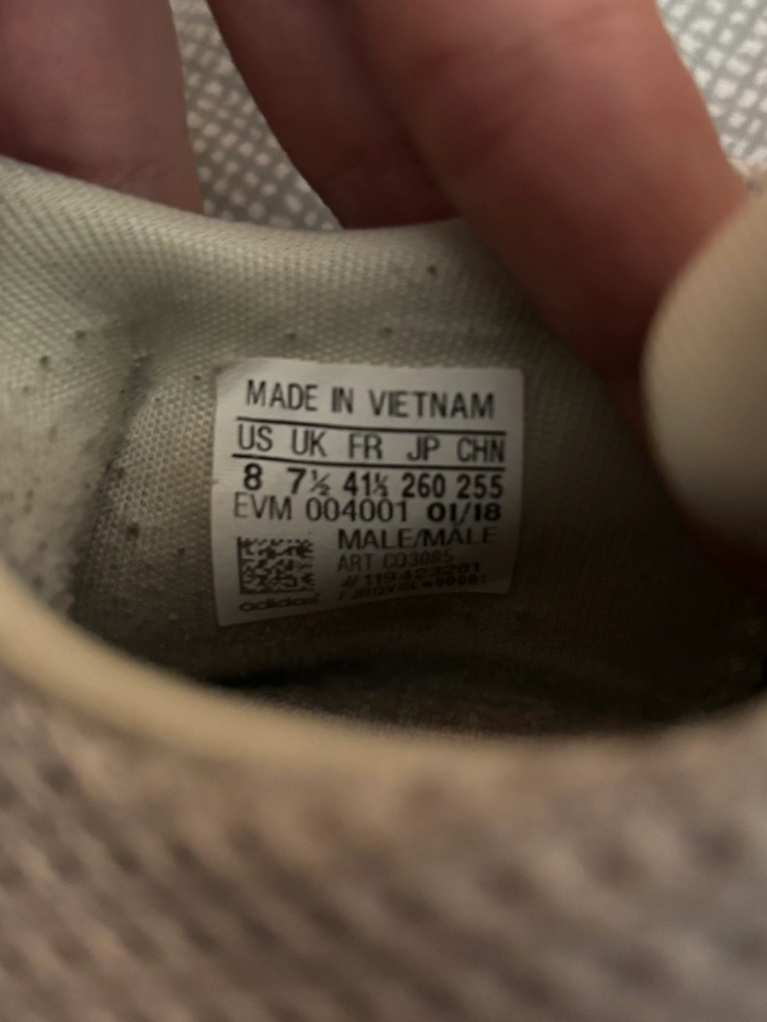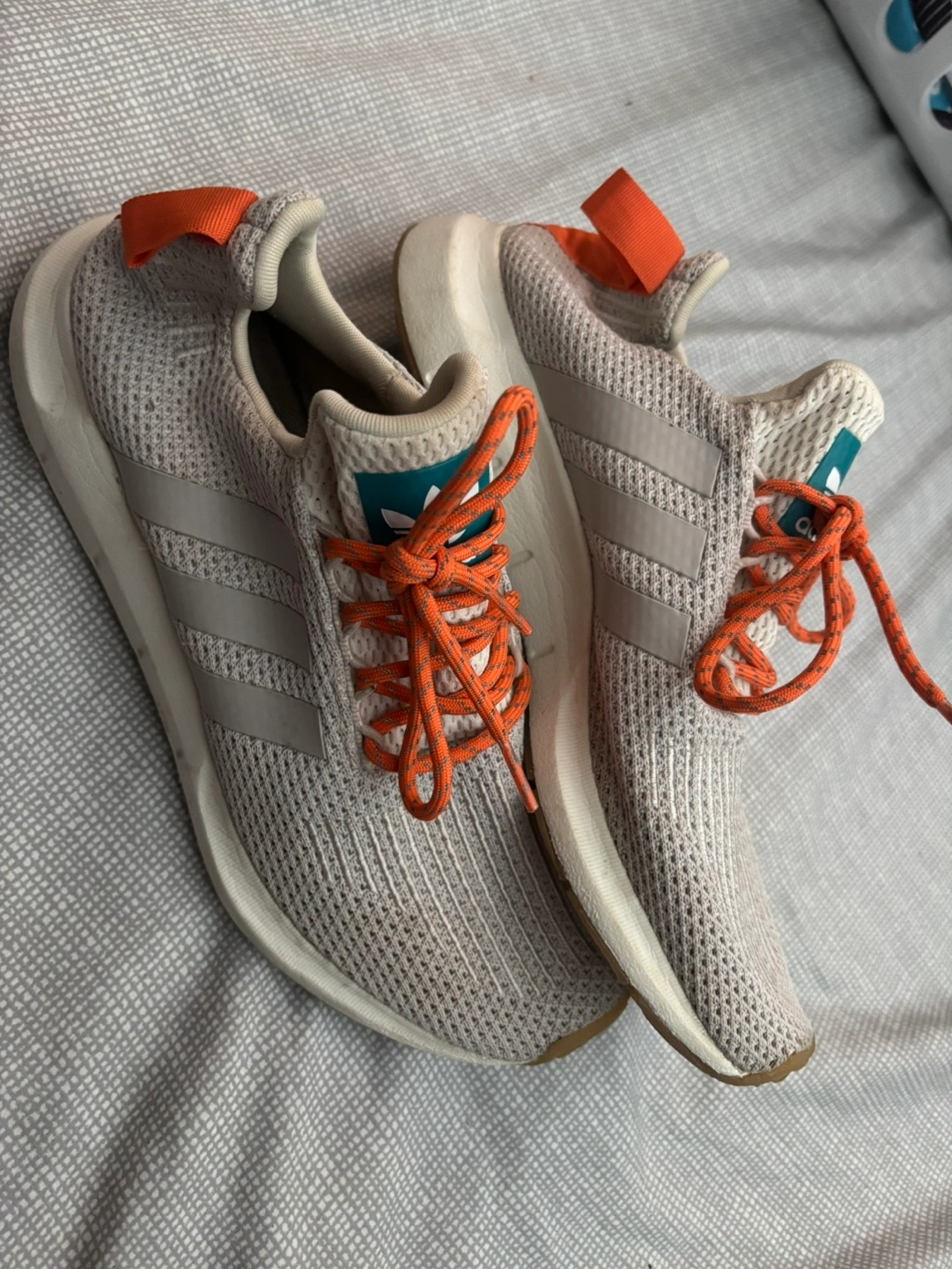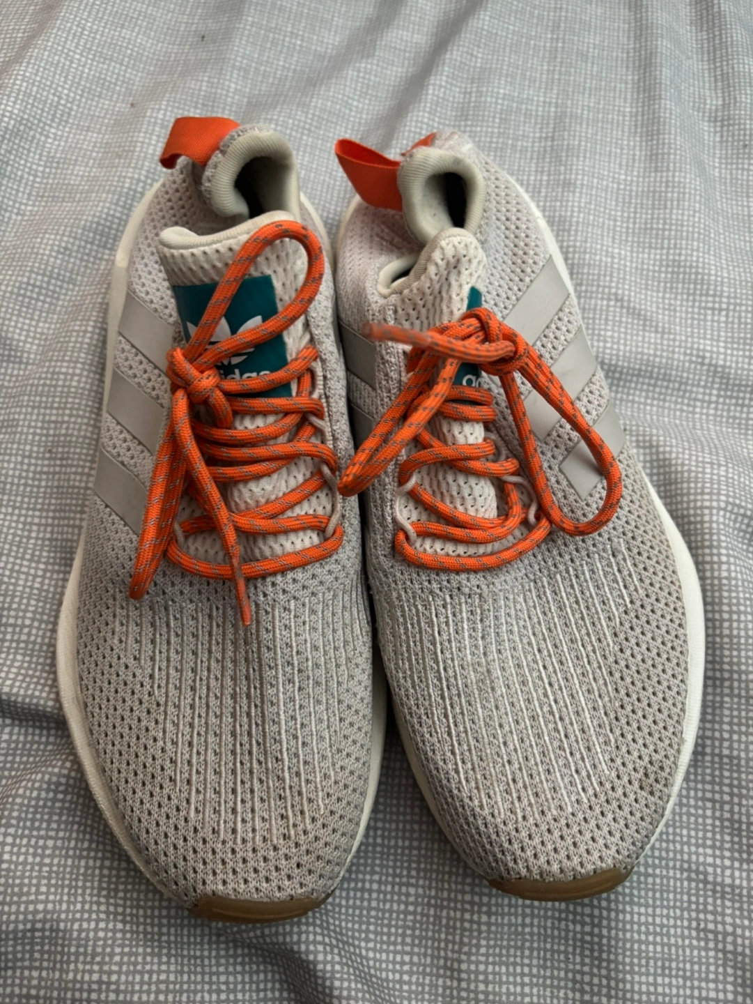 Lightly used Adidas running shoes. Men's size 8. Grey knit upper, orange laces, and tan sole. Made in Vietnam.