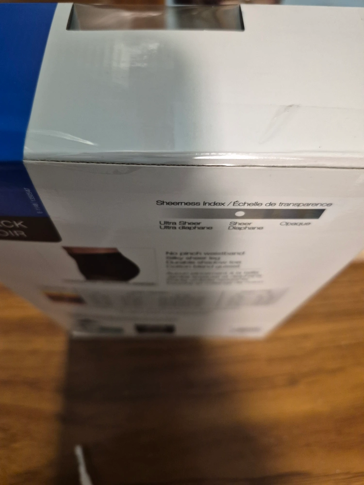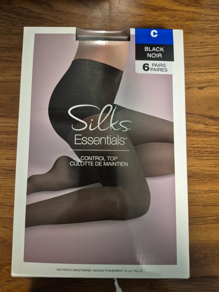 New Silks Essentials control top pantyhose. Six pairs of black size C pantyhose. No pinch waistband. Silky sheer leg. Features cotton blend gusset. Size chart and care instructions on box.