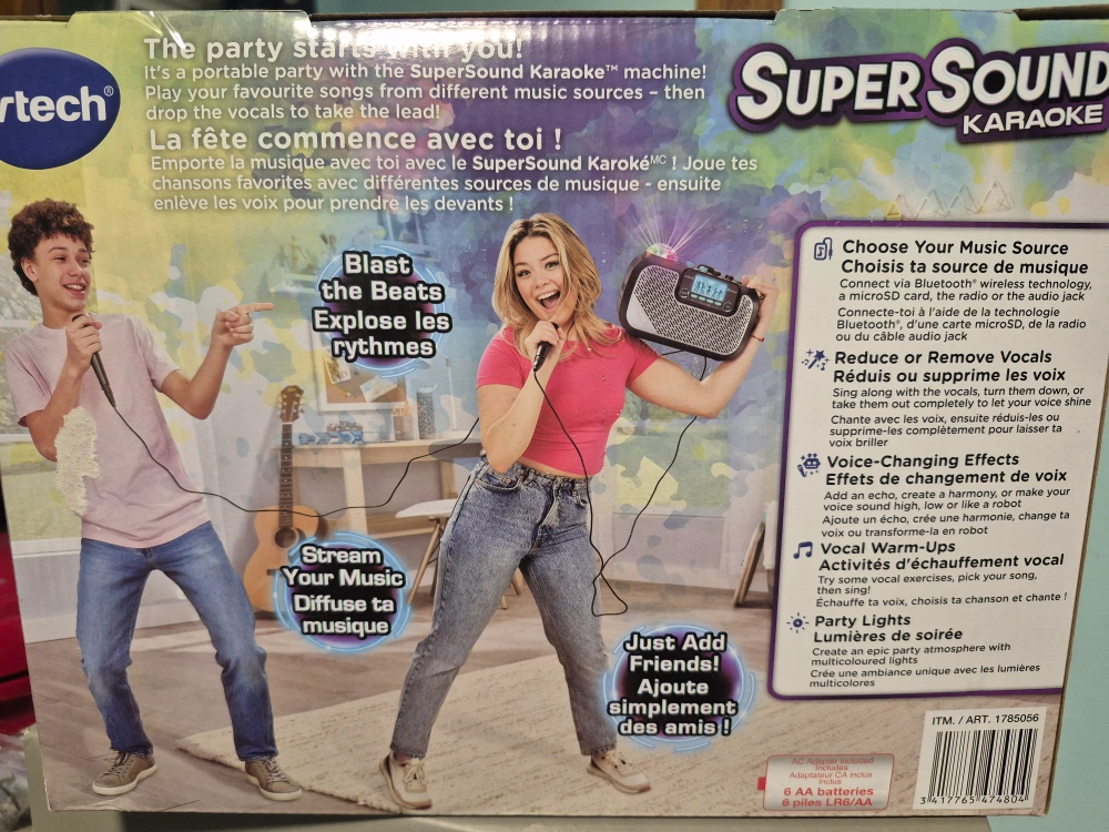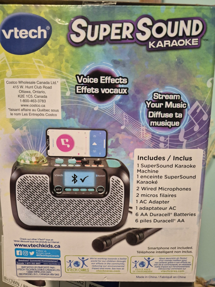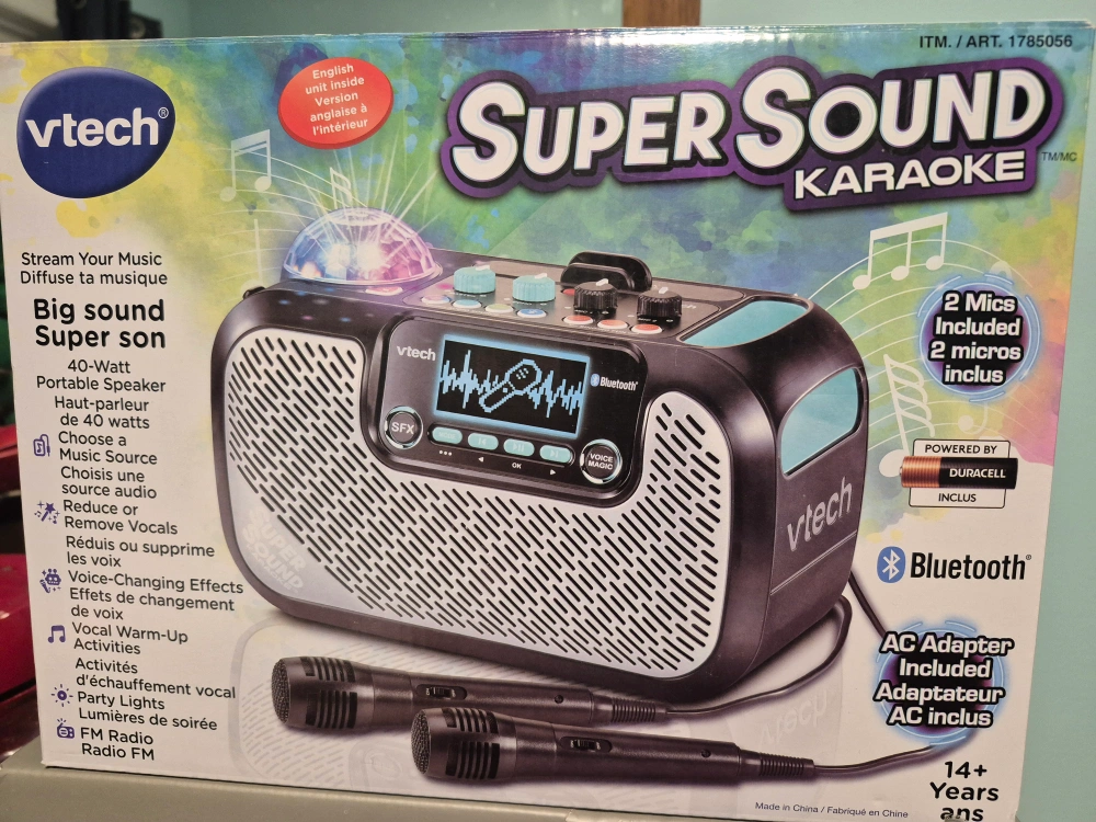 Portable karaoke machine. Includes two microphones, Bluetooth connectivity, and voice effects. Plays music from various sources. Great for parties!