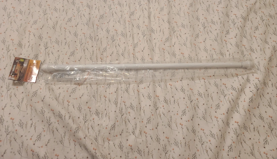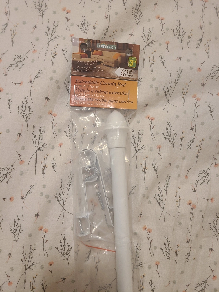 White extendable curtain rod. Adjusts from 27.5 inches to 48 inches. Includes brackets and screws. New in package. Selling because it's too small for my wondow.