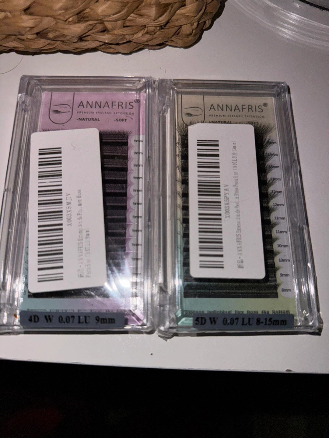 Two boxes of Annafris premium eyelash extensions. Individual lashes, various lengths. Natural and soft. New, unopened.