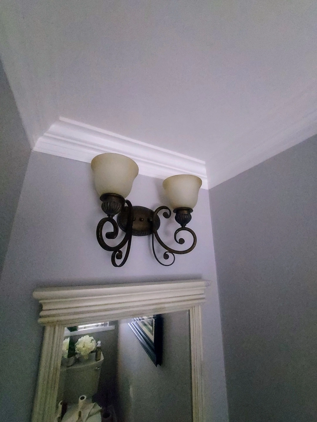 Selling a wall-mounted vanity light fixture. It has a bronze-coloured base with ornate detailing and two frosted glass shades. It would be a great addition to any bathroom or powder room
