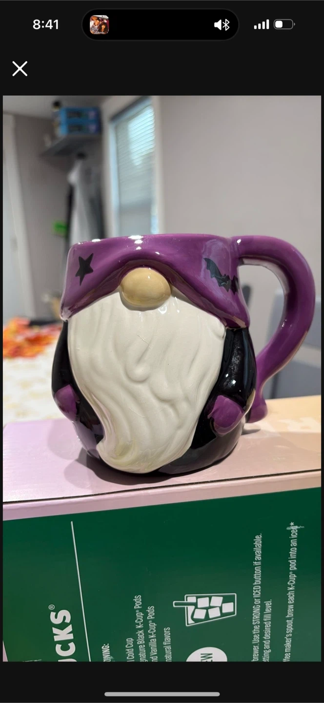 Super cute gnome mug with a Halloween theme! It features a purple hat with stars and bats, and a long white beard. It's in great condition and ready for a new home