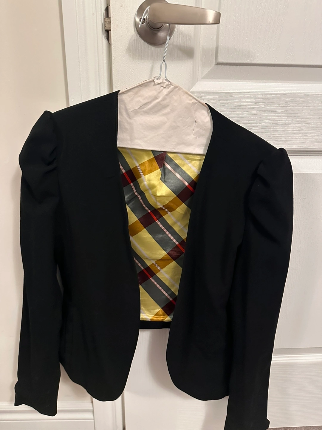 Black blazer, size medium. Features puff sleeves and a colourful plaid inner lining.