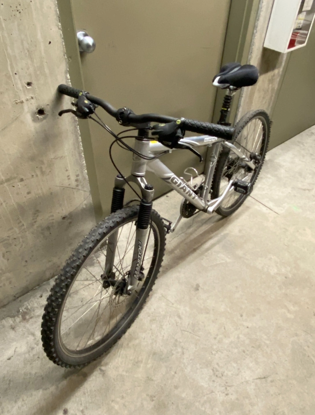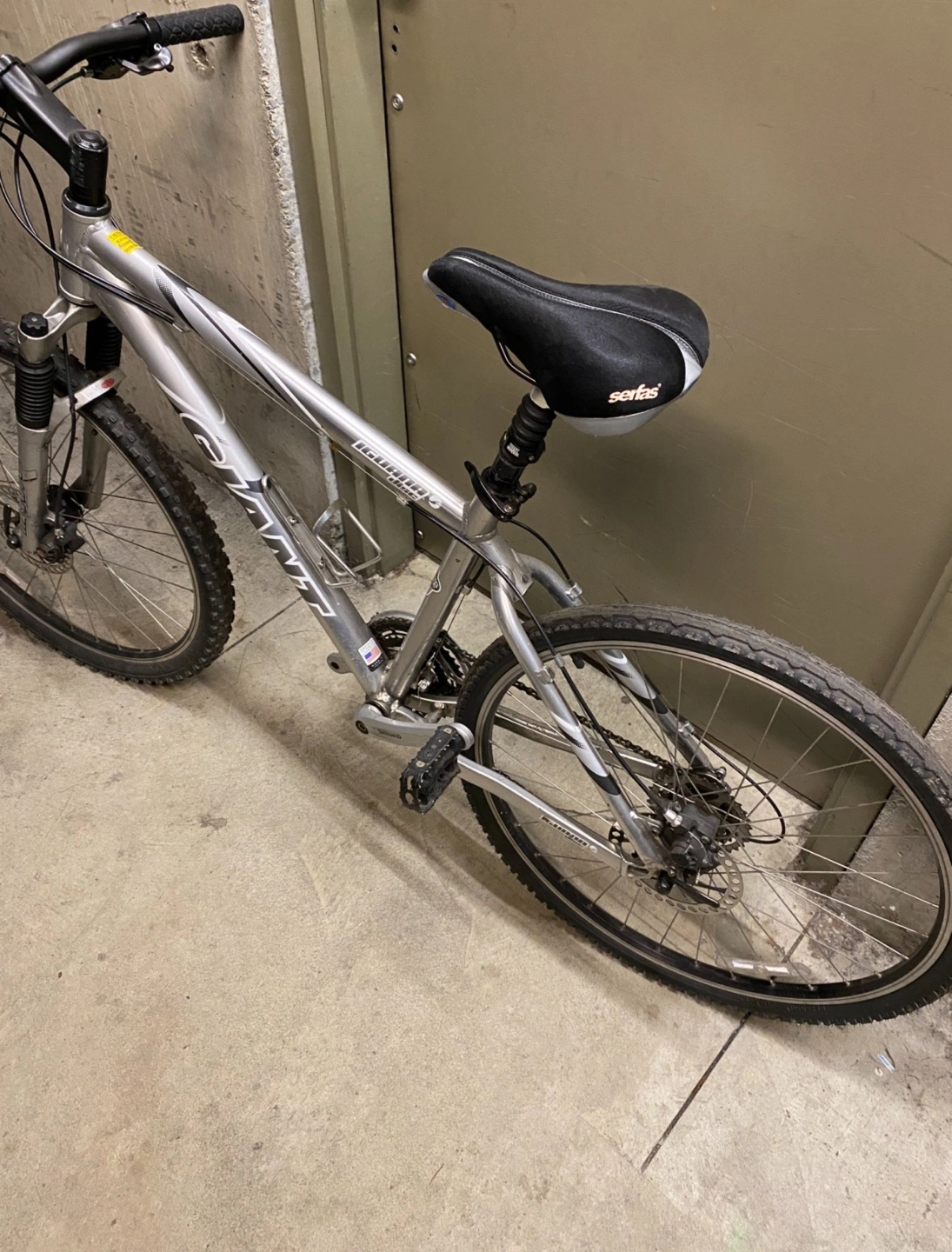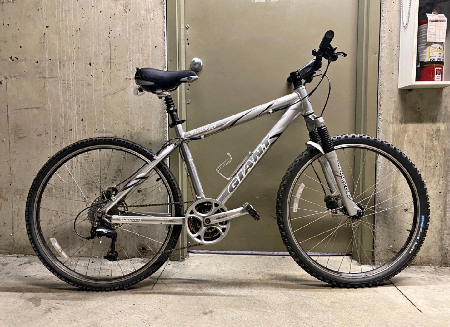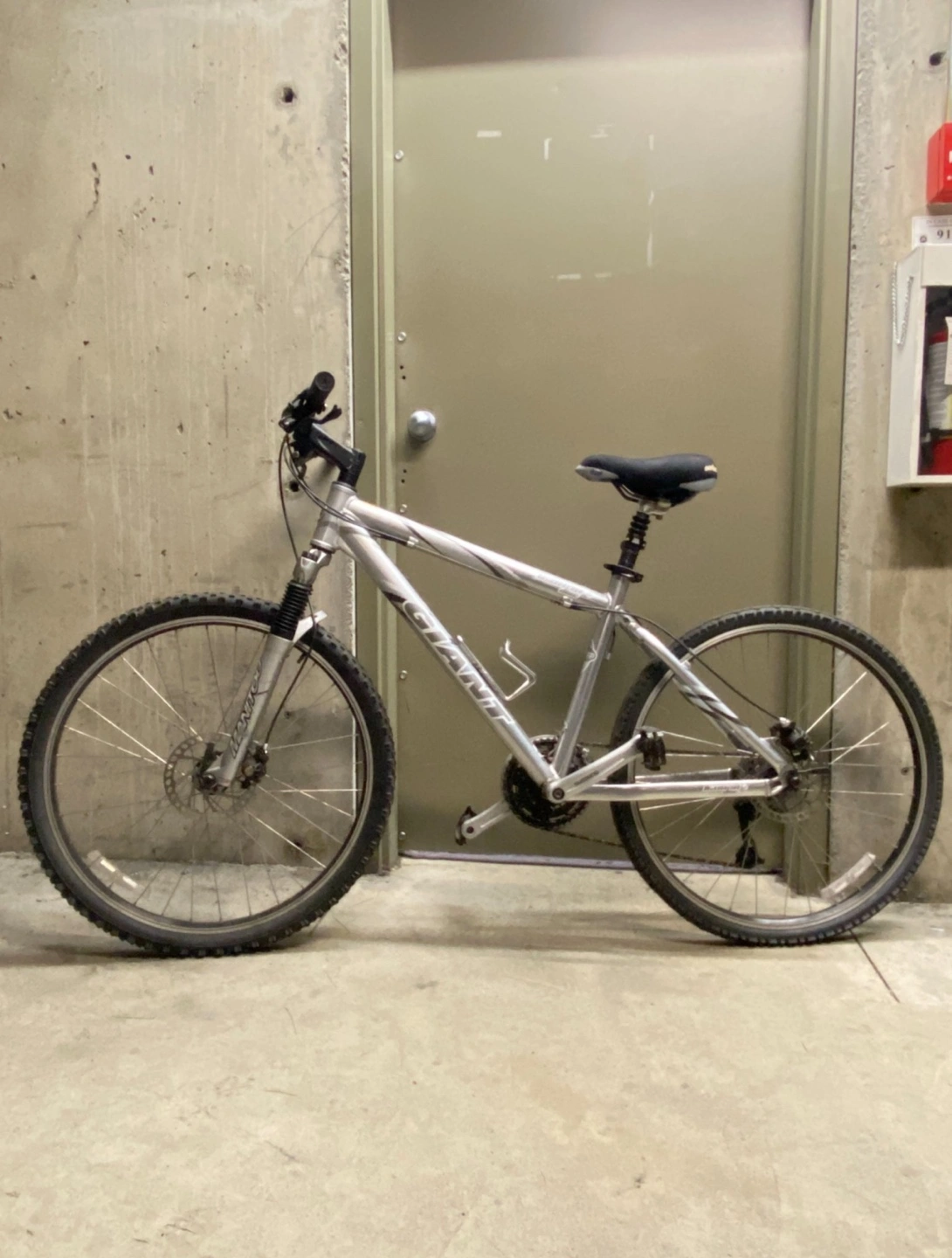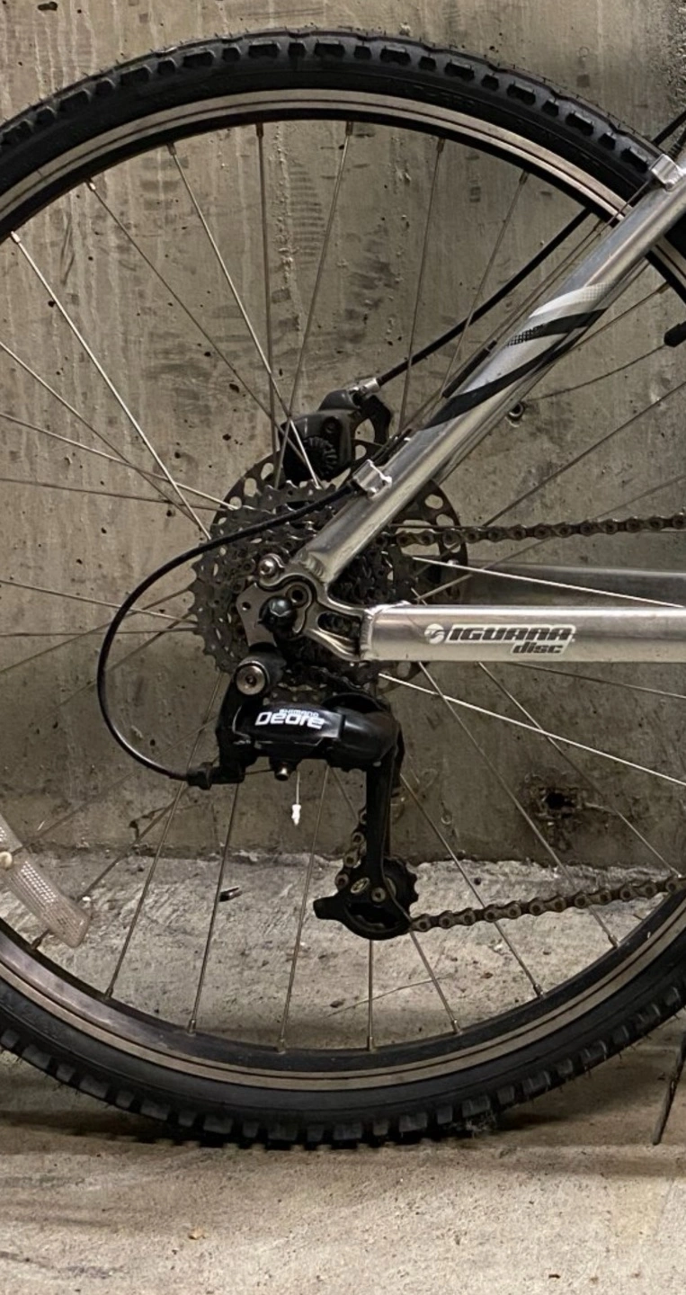 Used Giant Iguana disc mountain bike. Silver frame. 26" wheels. Disc brakes. Front suspension. Ready to ride.