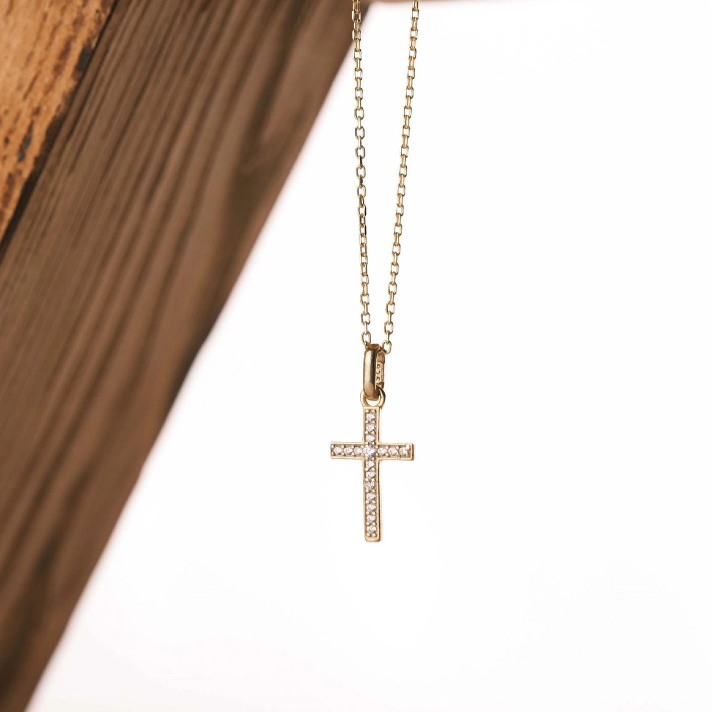 Delicate gold chain and small cross pendant. Clear stones line the cross. Simple and elegant.