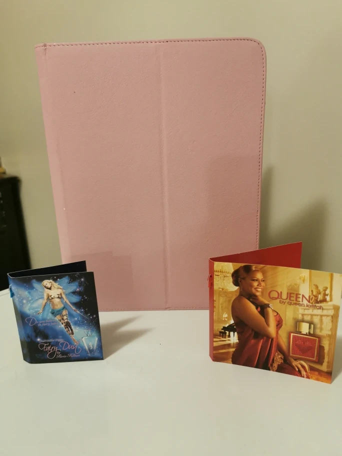 Pink tablet case from Temu, barely used. Includes two perfume samples: Fairy Dust by Paris Hilton and Queen by Queen Latifah. Great for travel!π§³