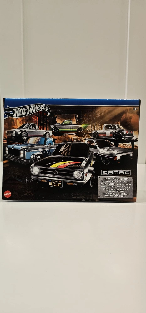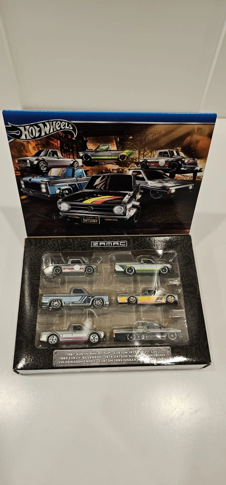 New in box Hot Wheels Zamac 5-pack. Includes five diecast vehicles: Volkswagen Caddy, Custom 1972 Chevy Luv, 1967 Austin Mini Pickup, 1975 Datsun Sunny Truck (B210), and Custom 1993 Nissan Hardbody (D21). Collectible set for enthusiasts.