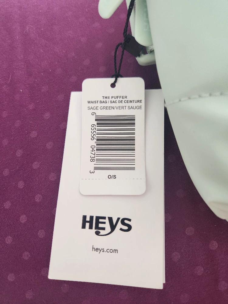 New with Tags HEYS The Puffer waist bag. Sage green colour. Adjustable strap. Small zippered compartment inside. Excellent condition.
