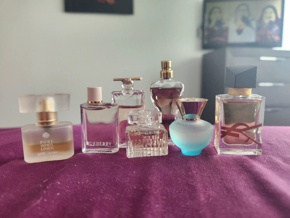 Collection of six miniature perfume bottles. Various brands and scents. Great for travel or sampling.