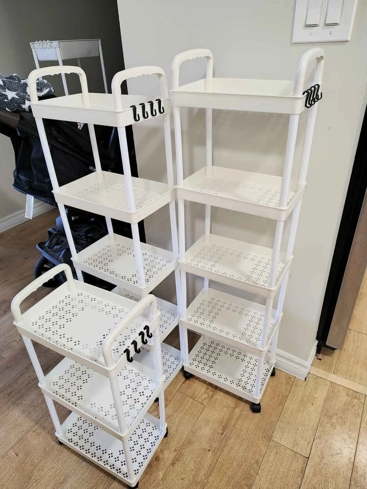 5 Layer storage with wheels and 4 hangers. Dimensions: 40 inches high x 12 inches width. All new. I have more pieces available. I just added some items to take pictures to show how it fits many items. Great for you or as a gift anytime.