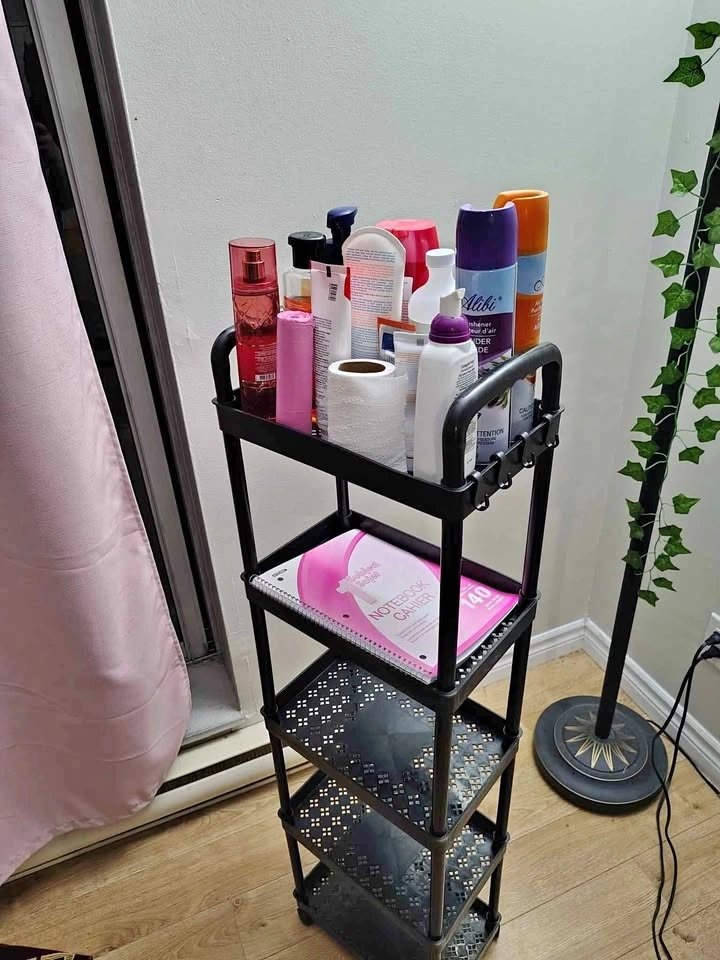 5 Layer storage with wheels and 4 hangers. Dimensions: 40 inches high x 12 inches width. All new. I have more pieces available. I just added some items to take pictures to show how it fits many items. Great for you or as a gift anytime.