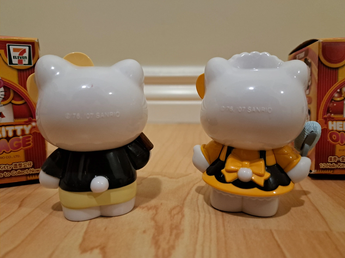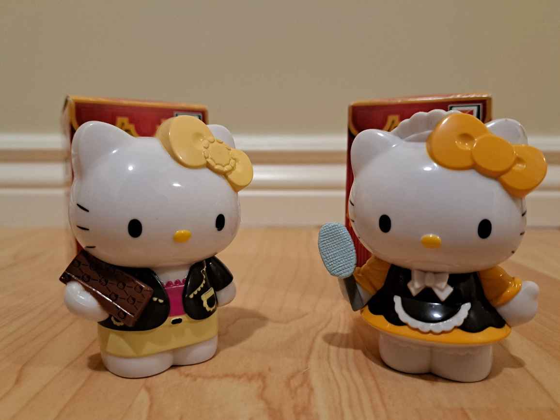 Two Hello Kitty figurines. One dressed as a chocolate shop worker, the other as a maid. Comes with original boxes. Collectible items from 7-Eleven.