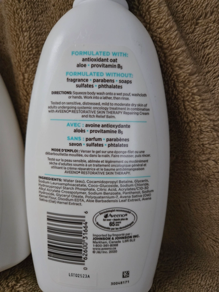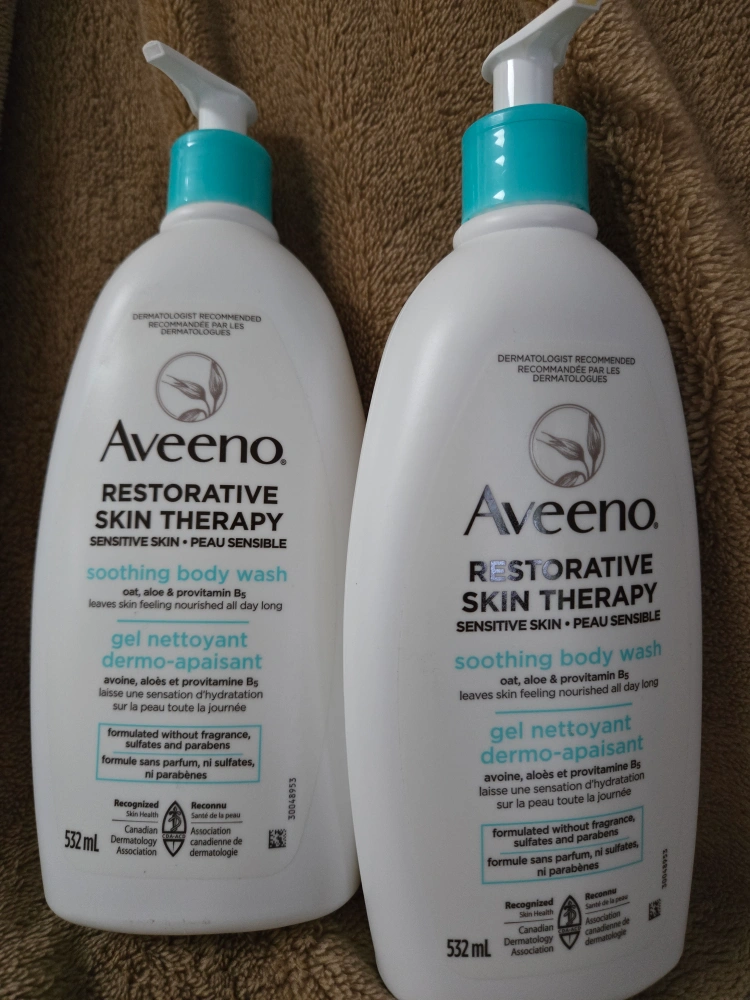 Two bottles of Aveeno Restorative Skin Therapy Soothing Body Wash. Dermatologist recommended. Formulated with antioxidant oat, aloe & provitamin B5. Fragrance, sulfate, and paraben free. Gentle enough for sensitive skin. I thought it was the cream I was buying, but saw it's the body wash and misplaced receipt. $13.00 for 1 bottle or $25.00 for both.