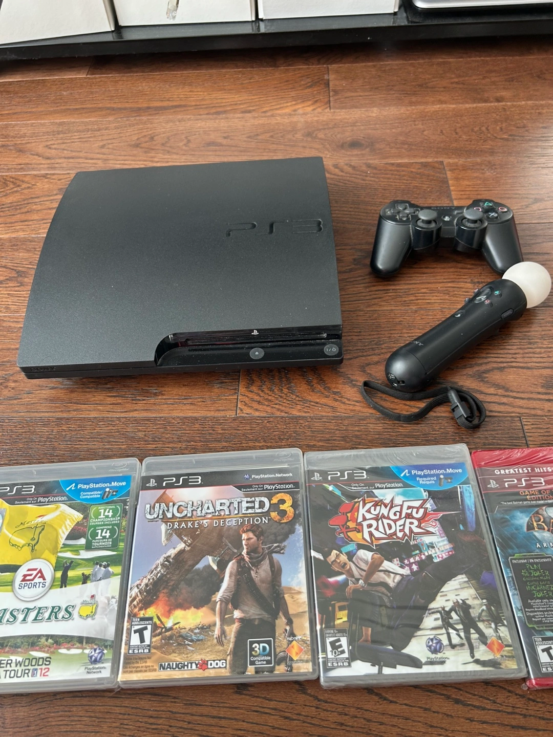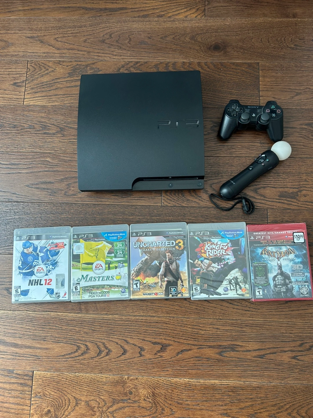 425Sony PlayStation 3 (PS3). Black console with one Sony controller, one PlayStation Move wand, and power cord. Five games also included (see pictures). Pick up near North York Centre station