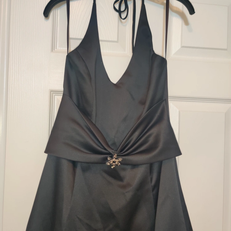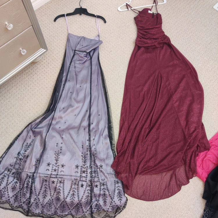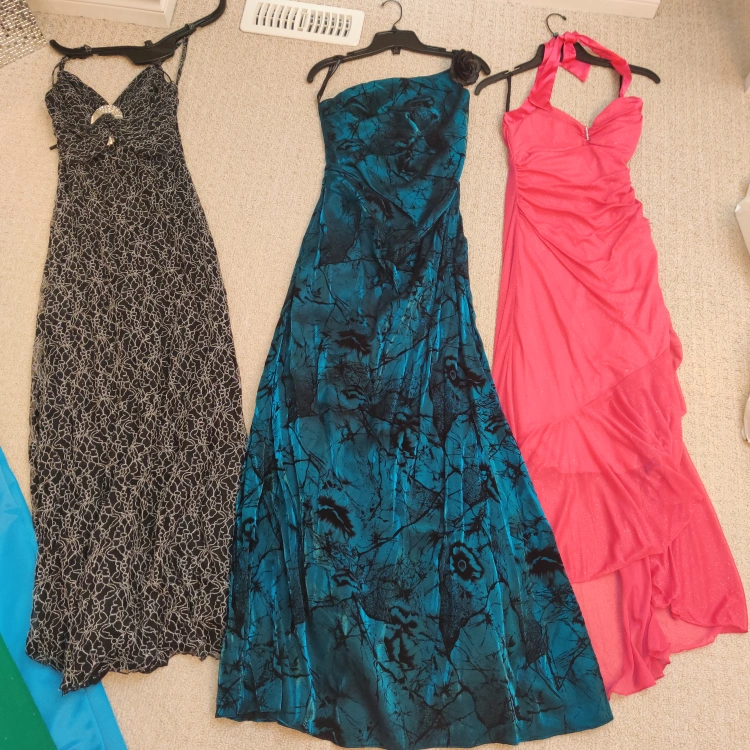 Assortment of ten long formal gowns. Variety of colours and styles. Includes floor-length, halter, and strapless options. Perfect for prom, special events, or other formal occasions.