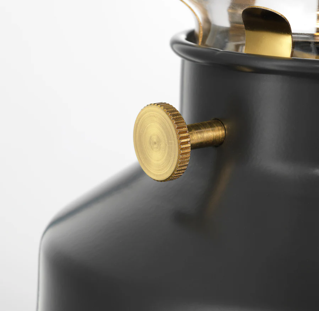 Dimmable anthracite table lamp. Glass shade and brass accents. Includes instructions.