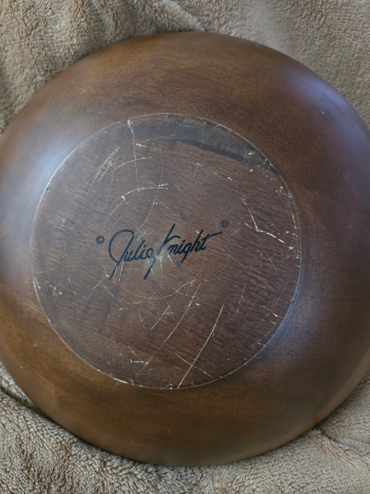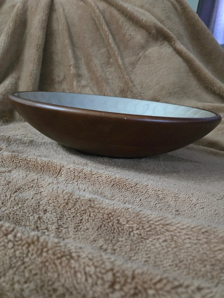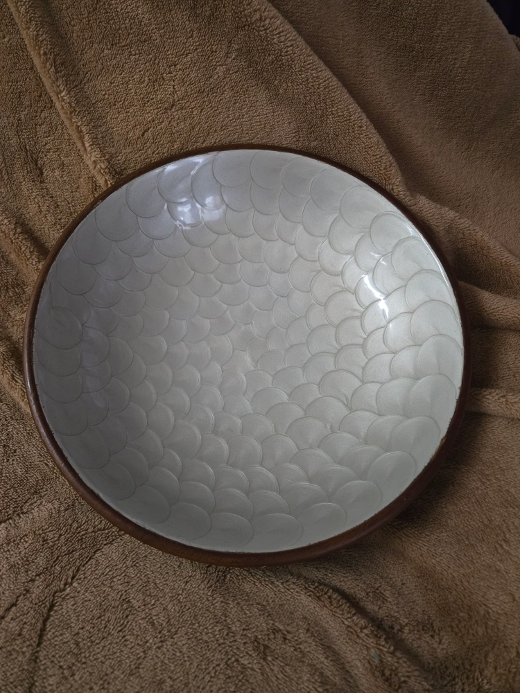 **Reduced** Large serving bowl. Unique scale pattern. Dark brown wooden rim. Off-white interior. Great for parties or everyday use. Just the bottom is a little scratched.