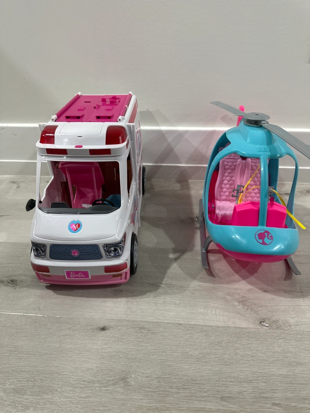 Barbie-branded ambulance and helicopter. Pink and white colour scheme. Features include opening doors and spinning rotors. Great for imaginative play.
