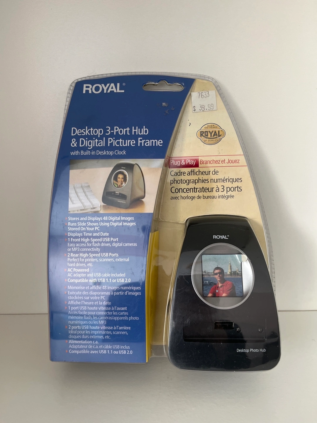 542Stores and displays 48 digital images. Runs slide shows using digital images stored on your PC. Displays time and date. Easy access for flash drives, digital cameras or MP3 connectivity. Perfect for printers, scanners, external hard drives, etc. AC powered. Includes AC adapter and USB cable. Compatible with USB 1.1 or USB 2.0. Built-in desktop clock.