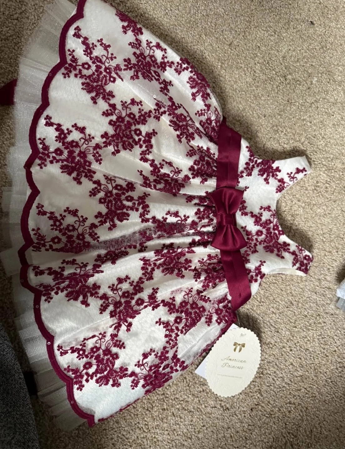 Beautiful burgundy floral embroidered dress. Scalloped hemline and tulle underskirt. Burgundy satin bow. Perfect for special occasions.
