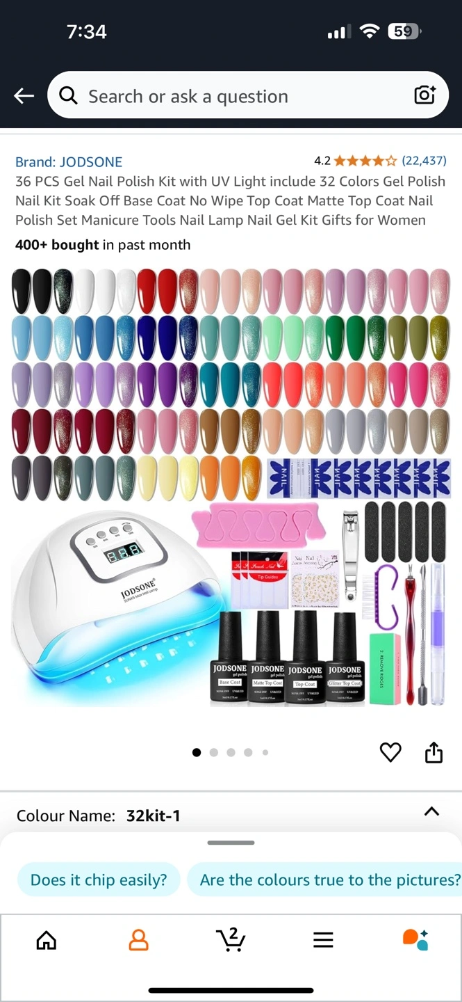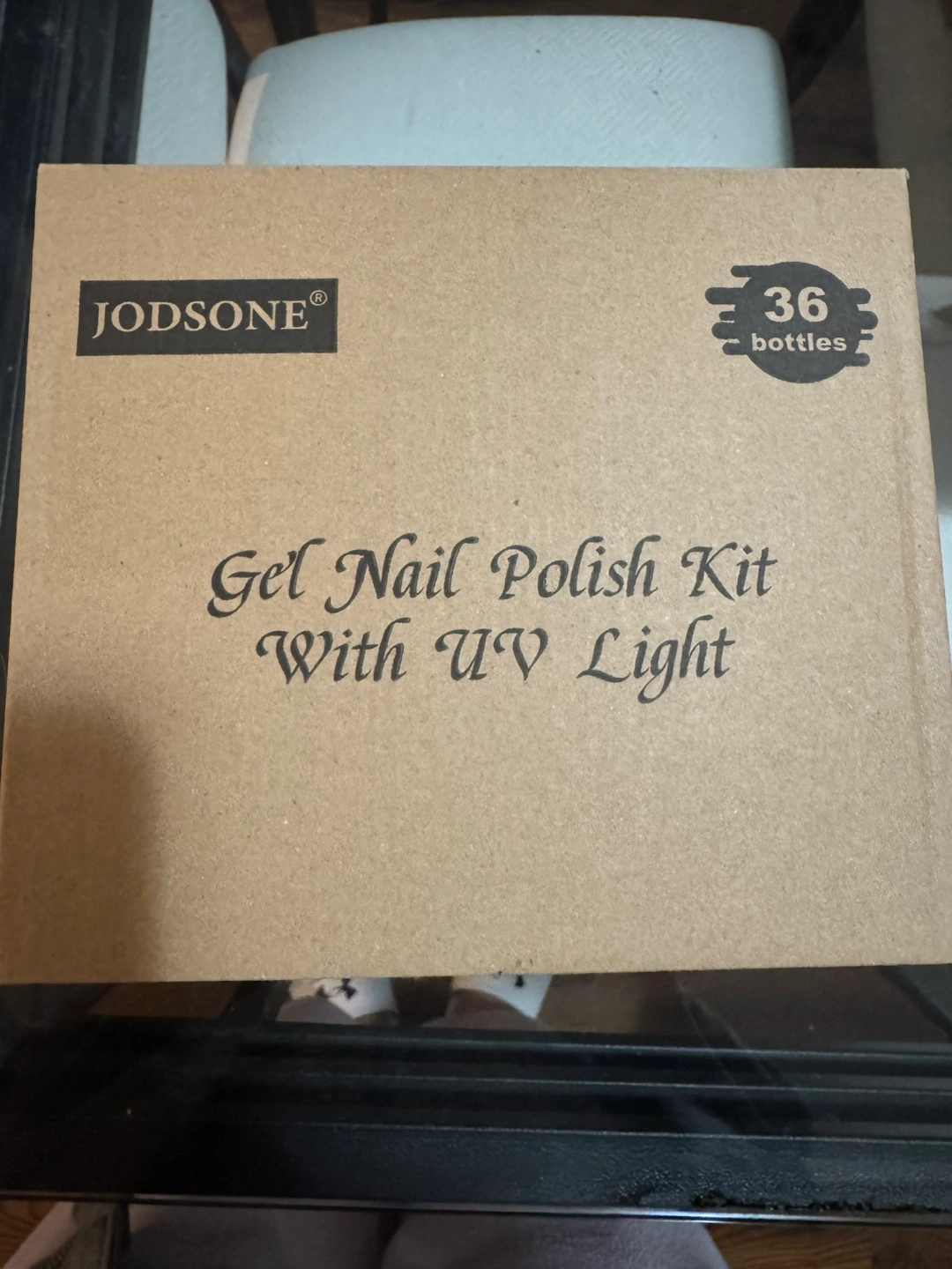 36 colour gel nail polish kit. Includes UV lamp, base coat, top coat, and other manicure tools. Great for at-home manicures.
