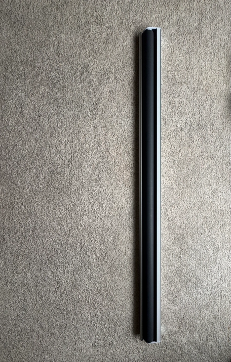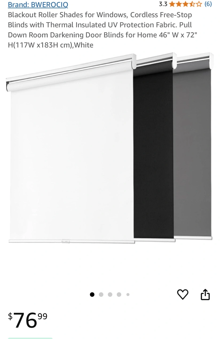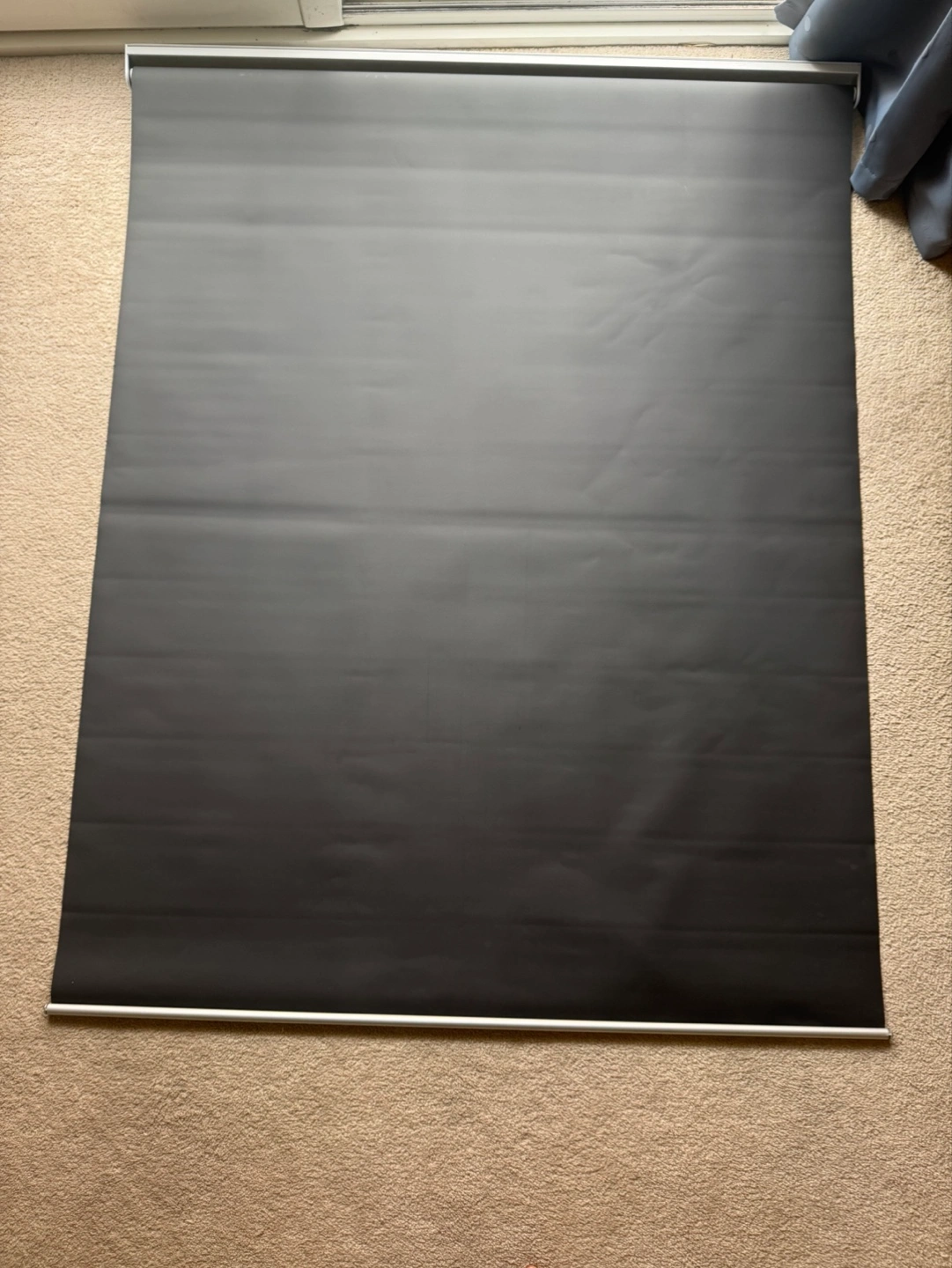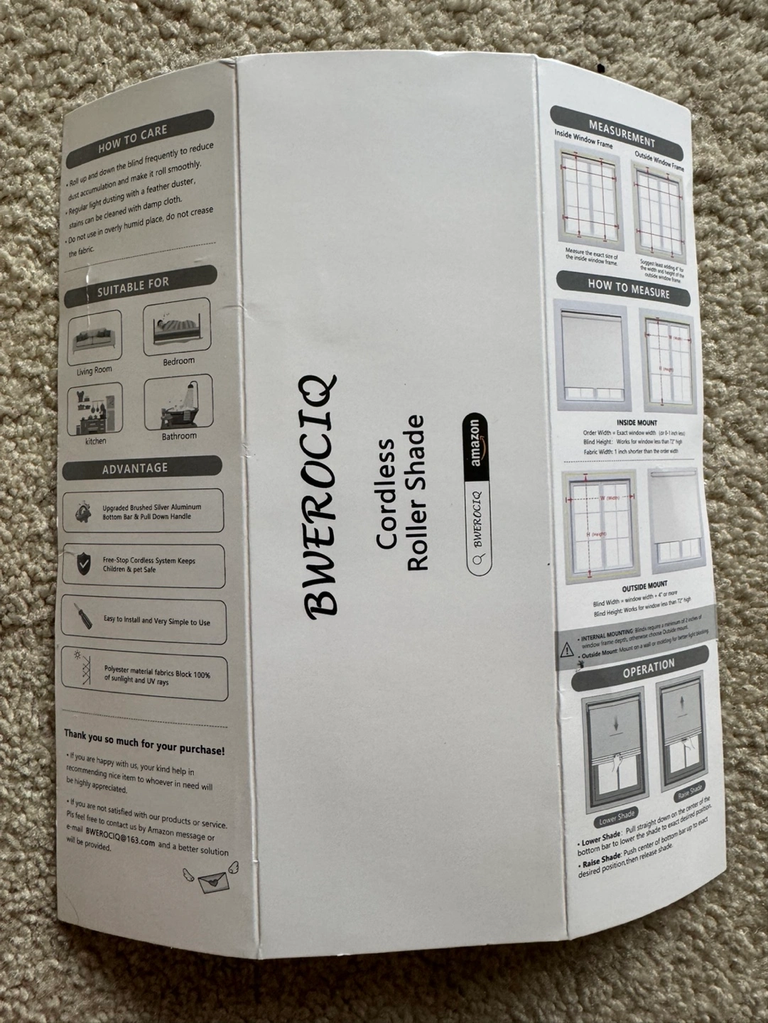 Black cordless roller shade. Easy to install. Suitable for living room, bedroom, kitchen, or bathroom. 100% polyester material blocks sunlight and UV rays.