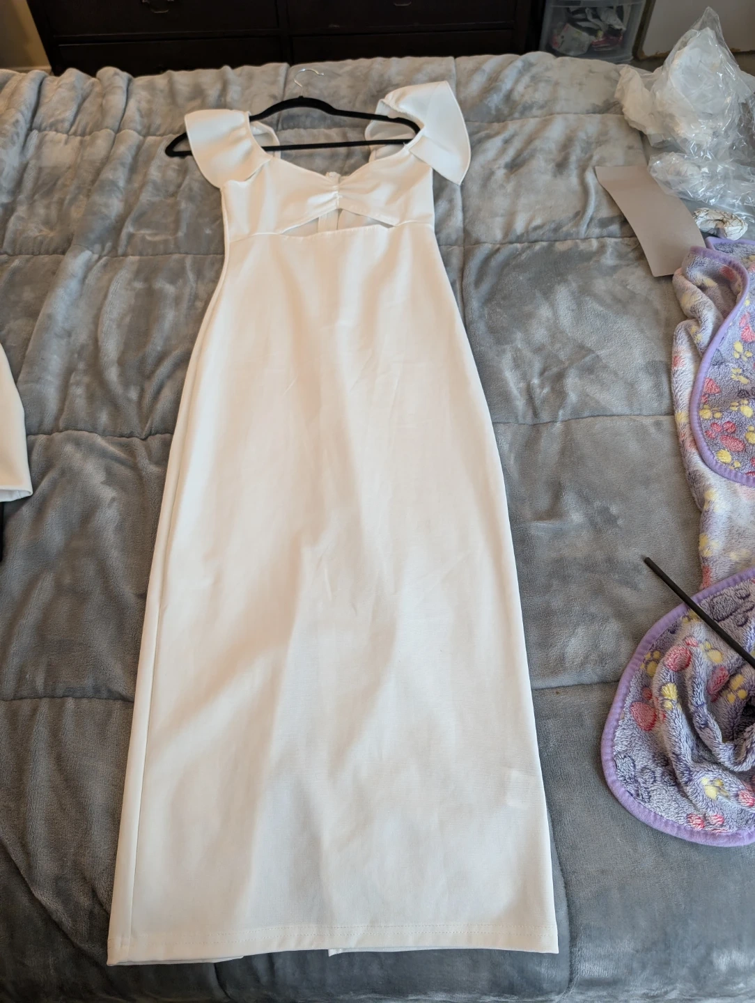 This elegant white maxi dress features a flattering cutout detail and off-the-shoulder flutter sleeves. It's a beautiful option for special occasions. Polyester blend material. Shein brand. Nice dress for a special occasion.