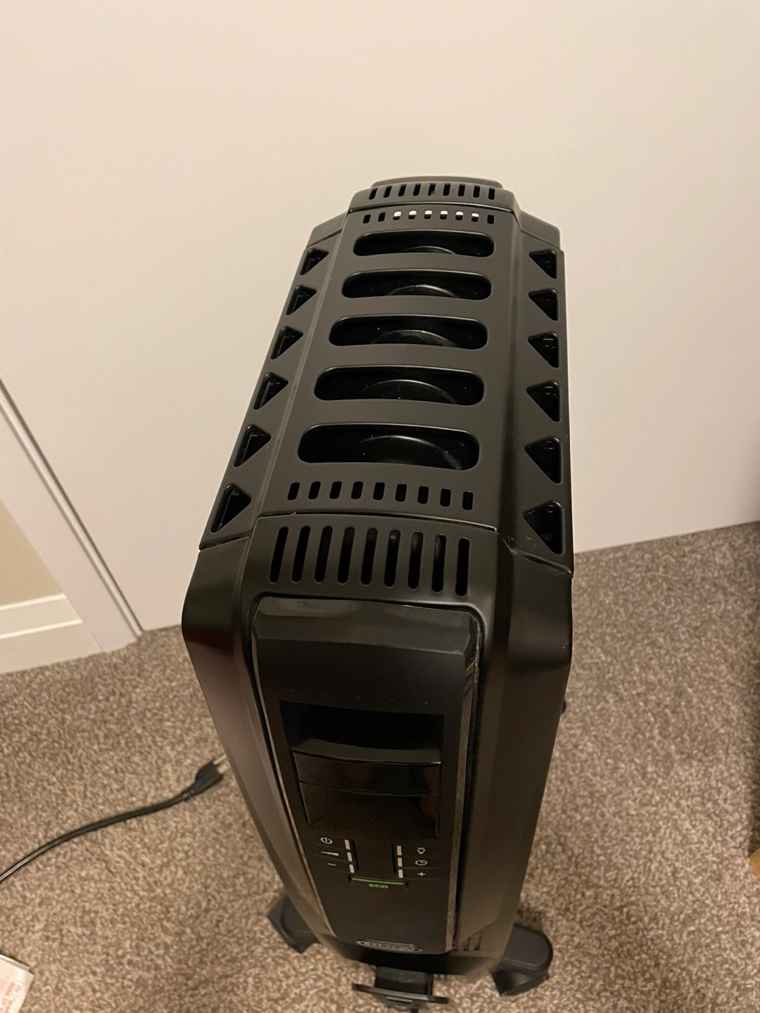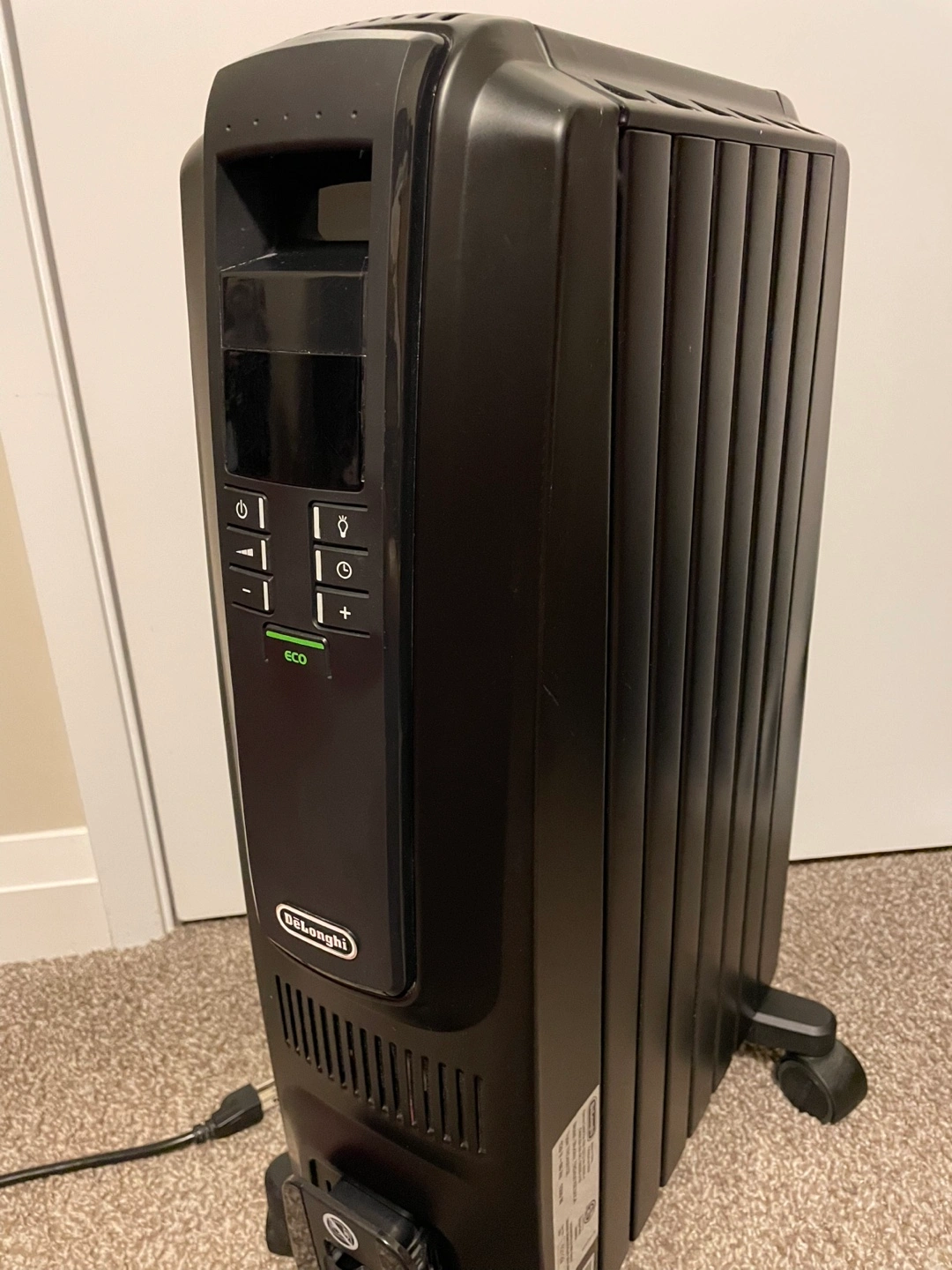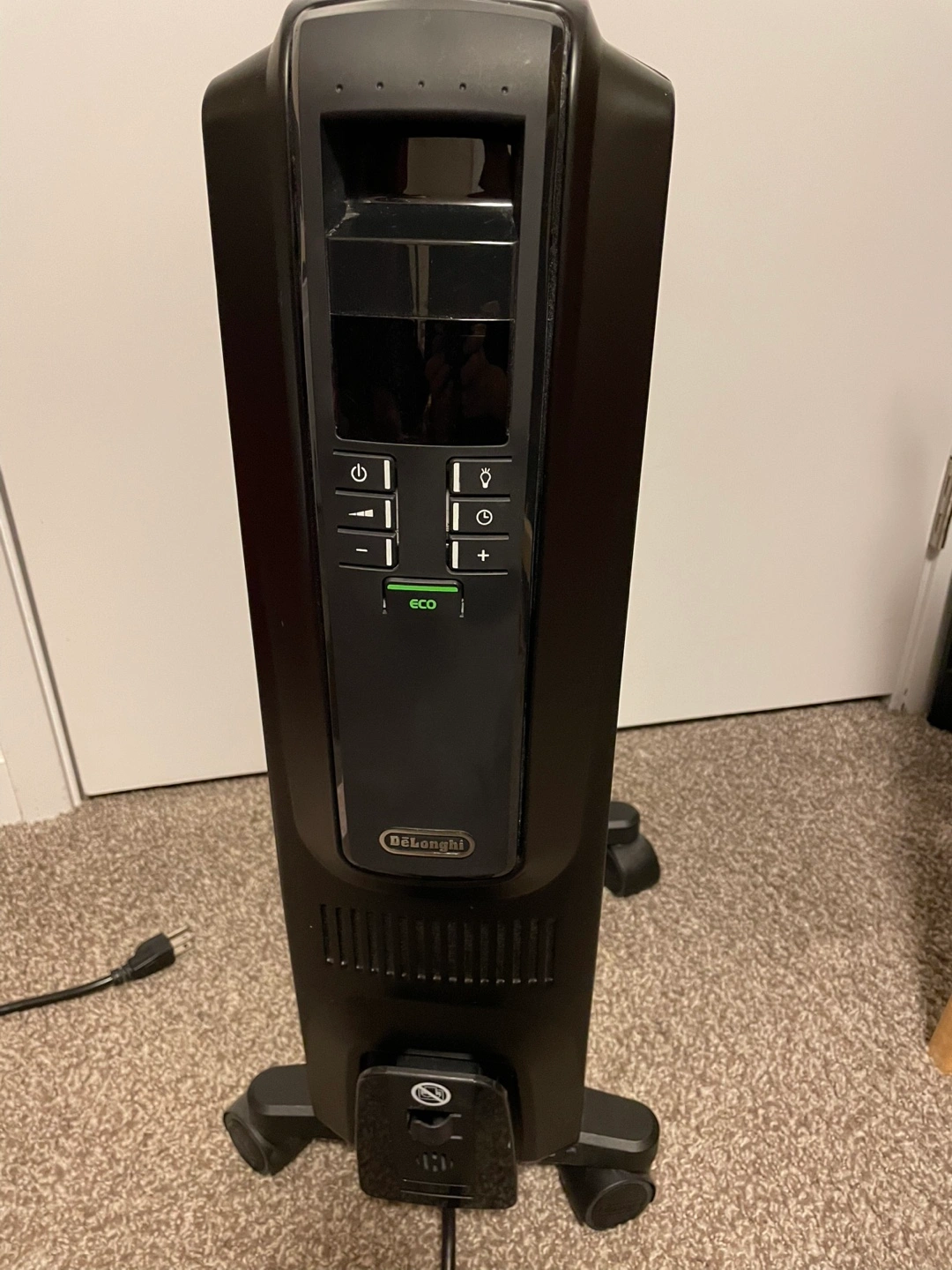 Excellent condition. Like new. Black. Digital controls. Multiple heat settings. Energy-saving ECO mode. Casters for mobility. Cord included. Can deliver if not far