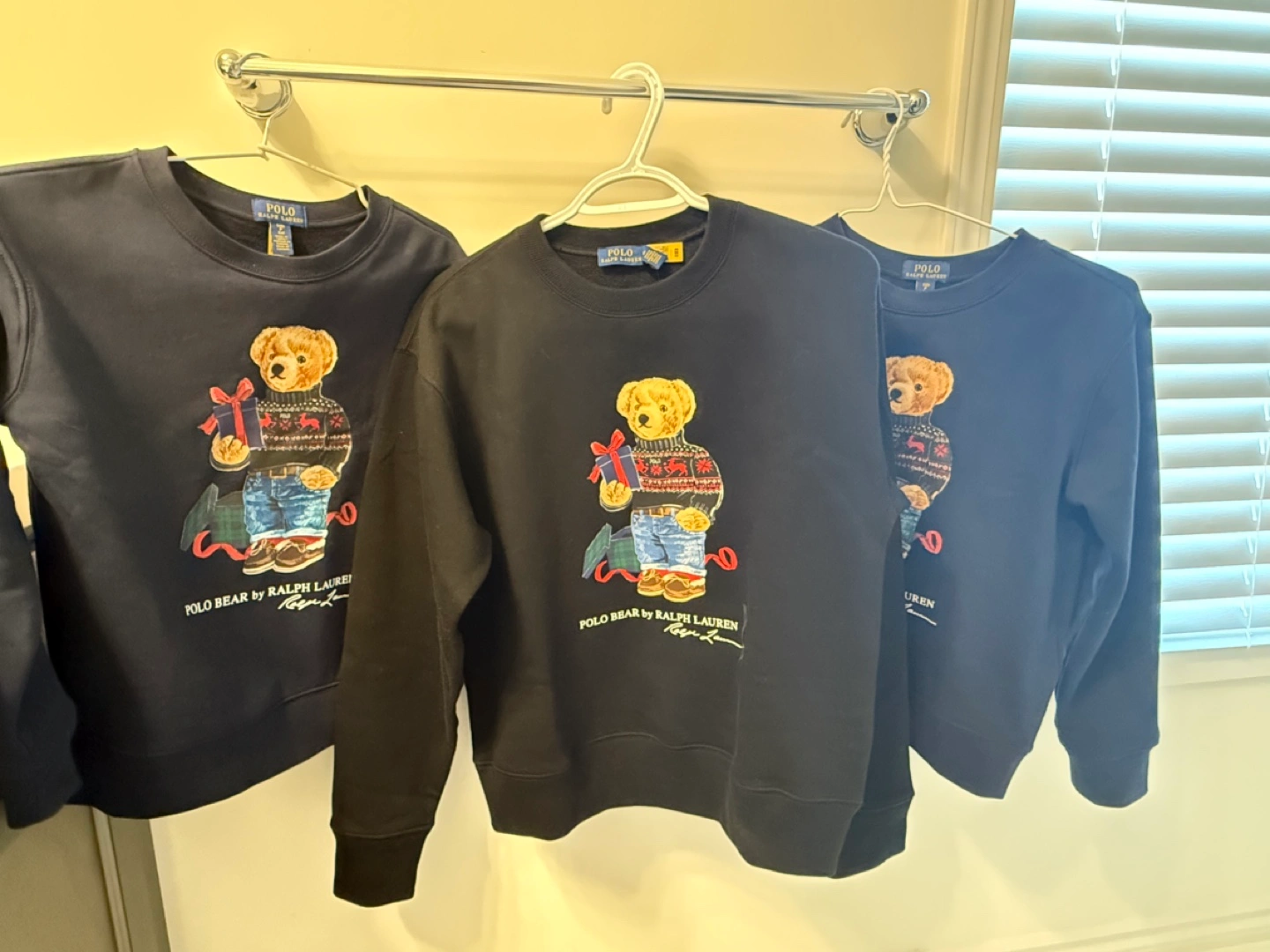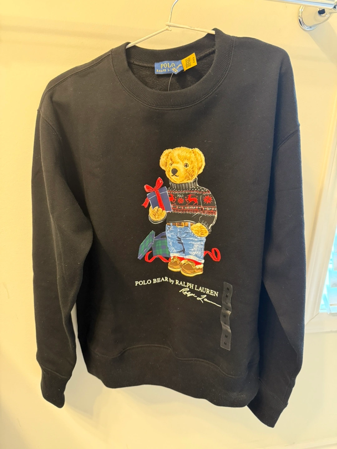New with tags. Black crewneck sweatshirt. Features a festive Polo Bear graphic. Size medium.