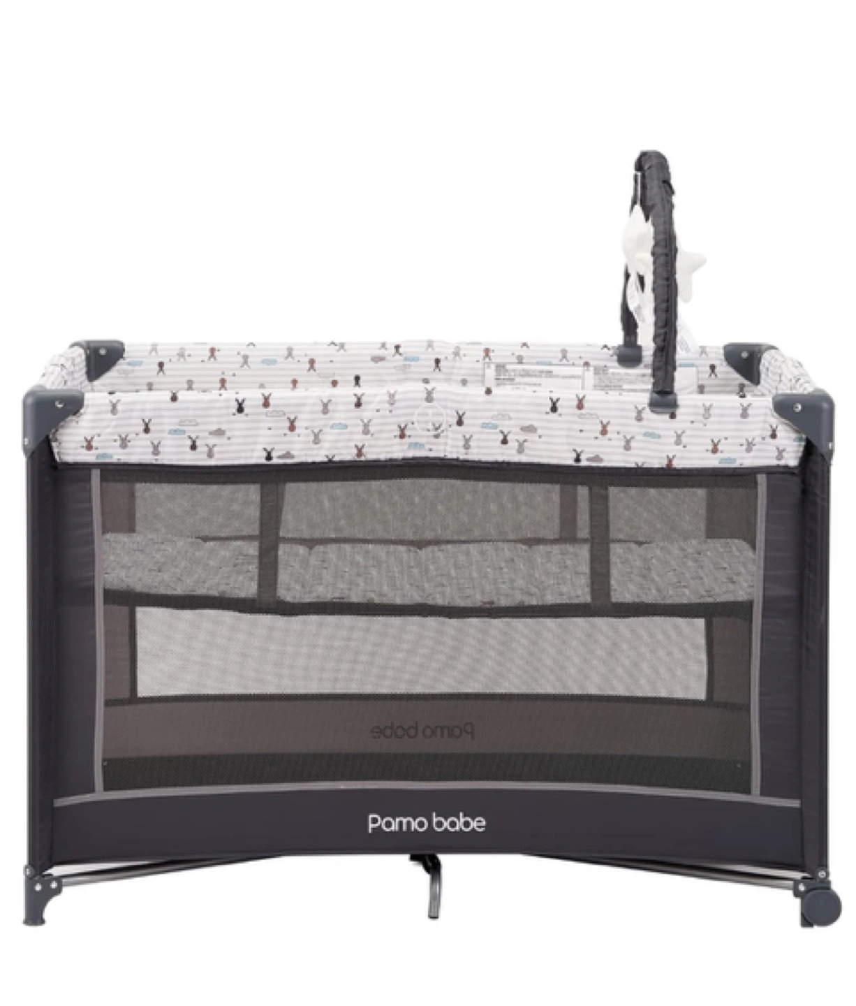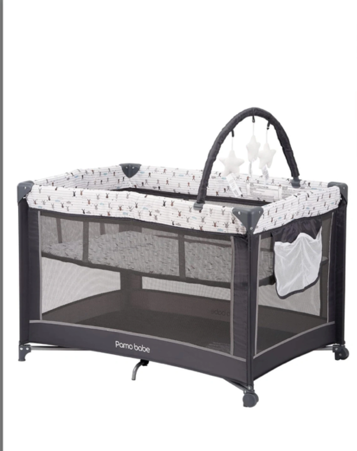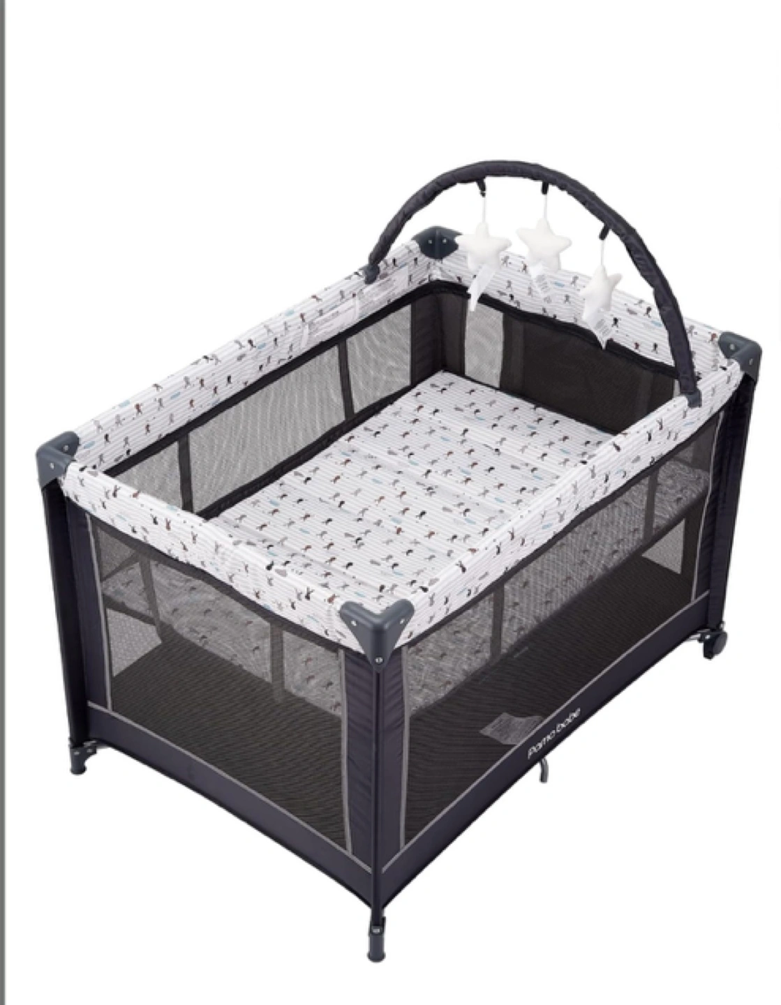 50Portable playard, easy to fold and store. Features a cute animal print and includes a detachable toy bar with plush star toys. Great for travel or home use.