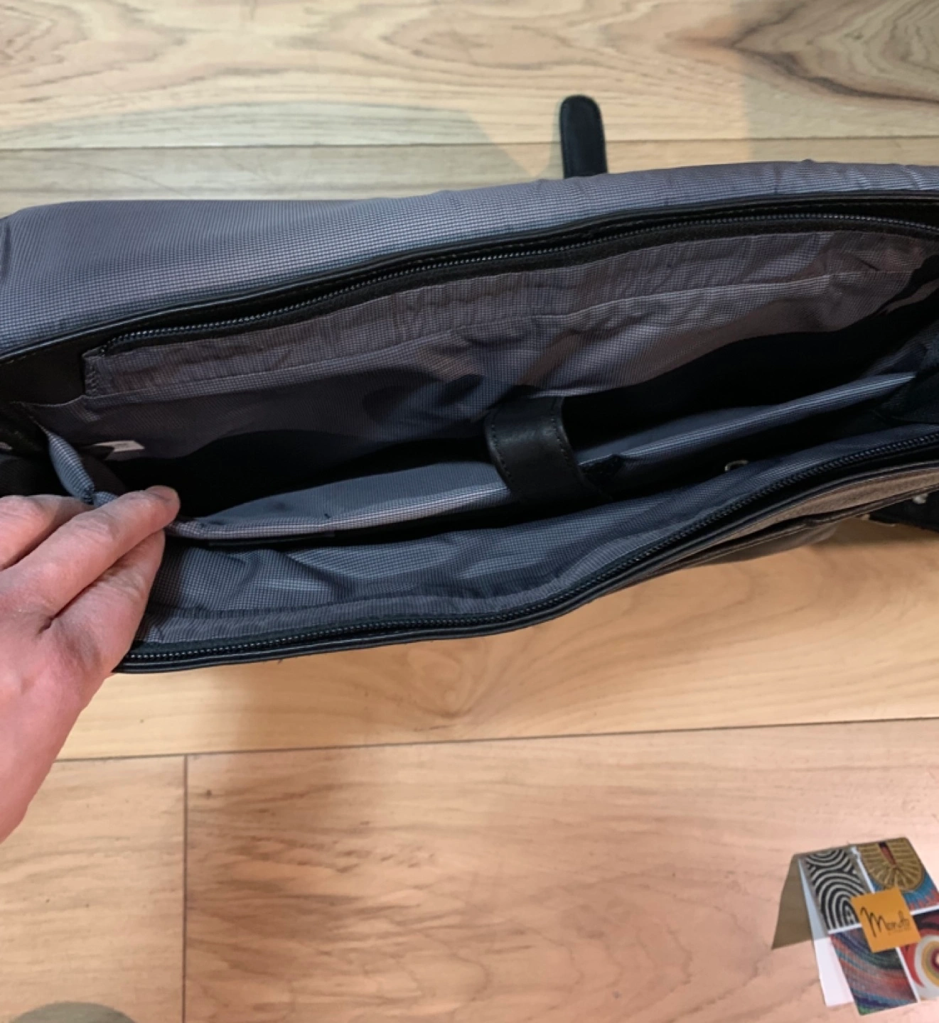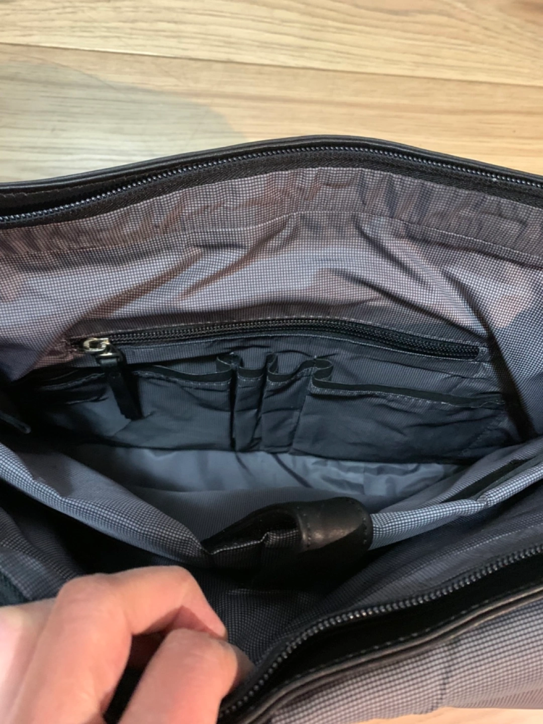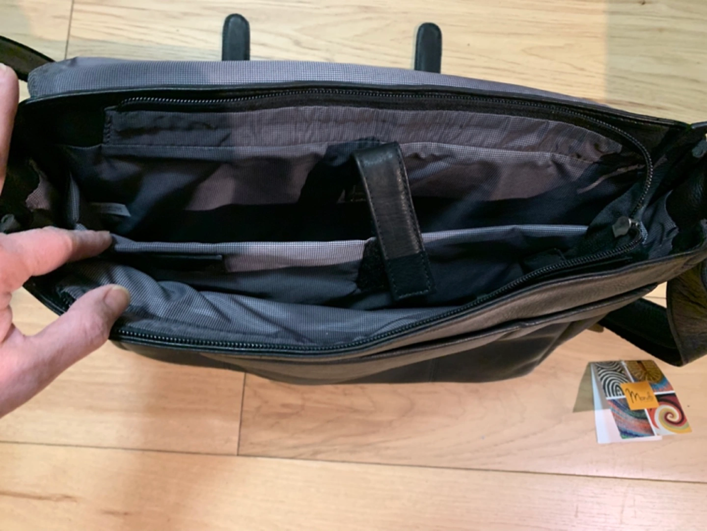 Multiple interior pockets and separate laptop compartment. Extra pocket with zipper at back as well.