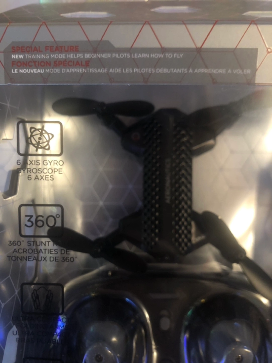 Ultra-compact folding micro drone. Features 3 speed settings, push-button 360° stunt rolls, and a new training mode. Includes 6-axis gyro for smooth and stable flight. LED head and tail lights for visual orientation.