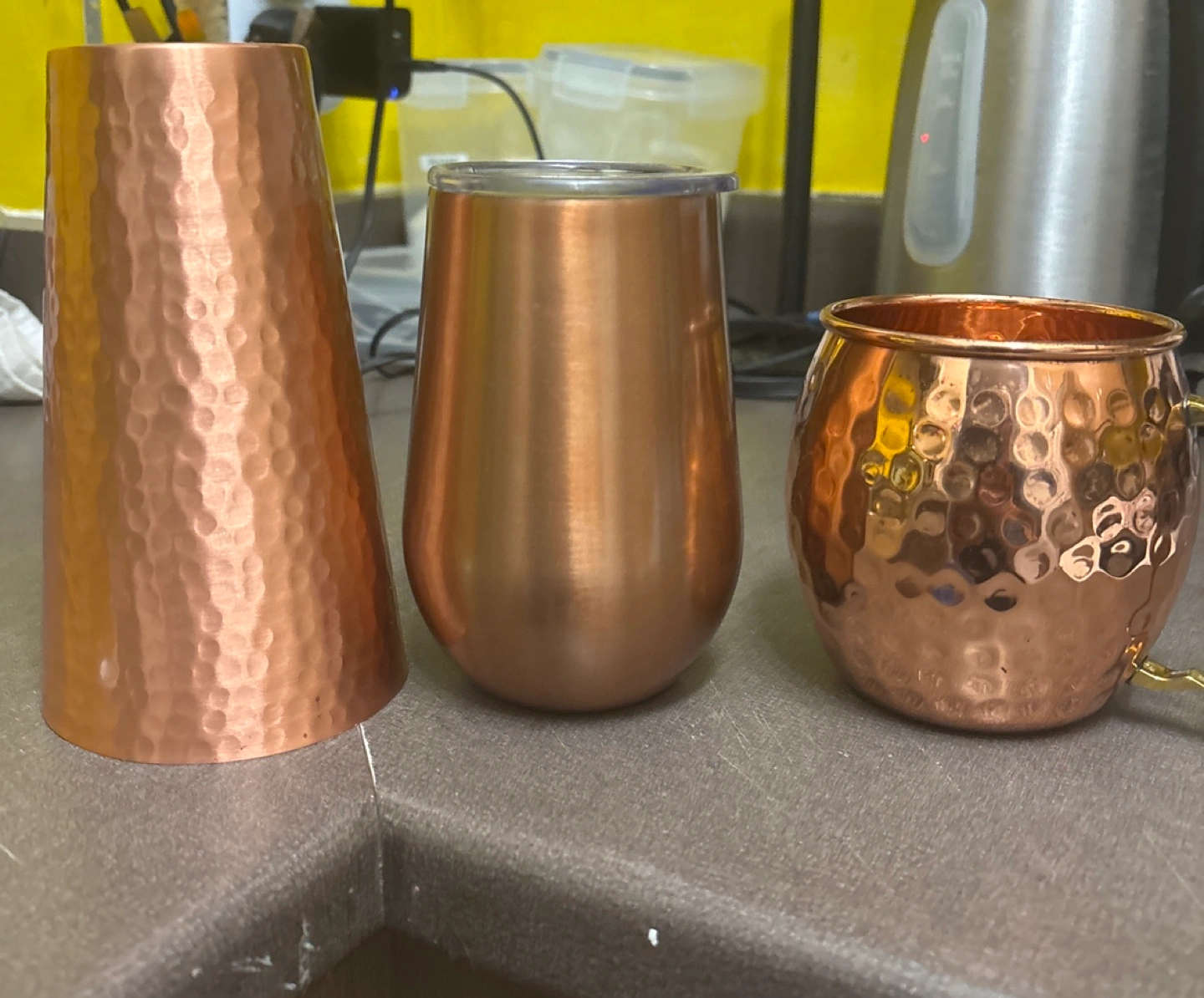 Three hammered copper mugs, varying sizes. One is a tall, slender style; another is a shorter, wider style with a handle; and the last is a wine tumbler style with a lid. Perfect for cocktails or other beverages.
