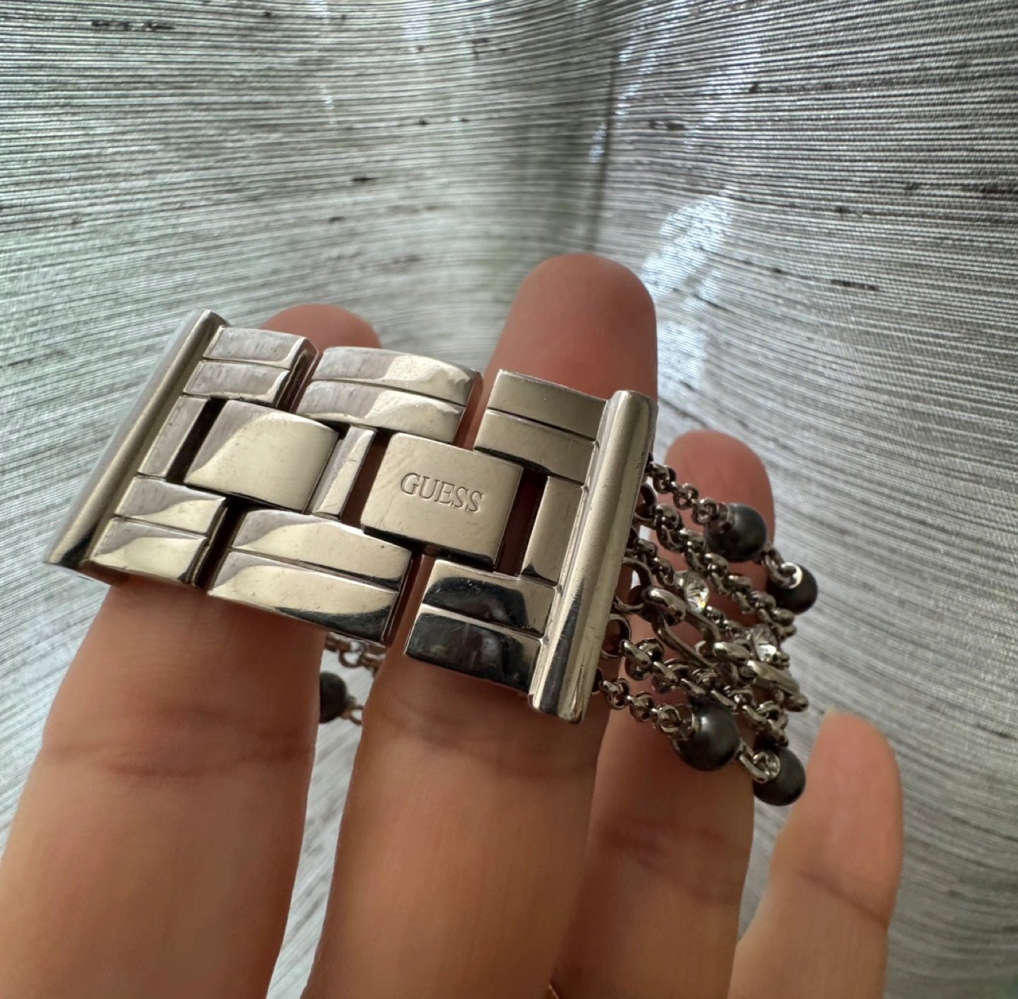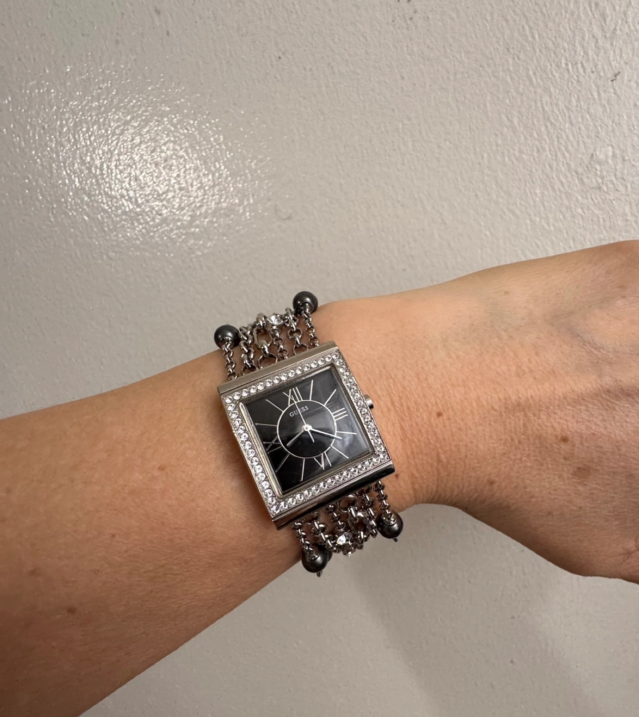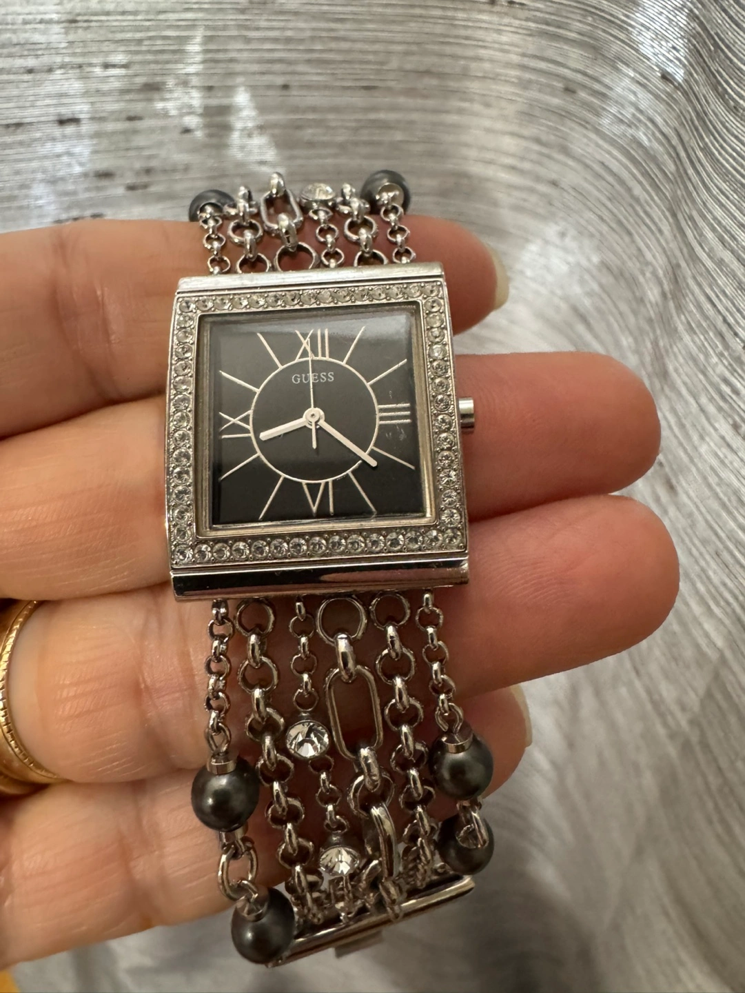 Silver tone Guess watch. Square black face with crystal accents. Features a unique beaded bracelet. Pre-owned.