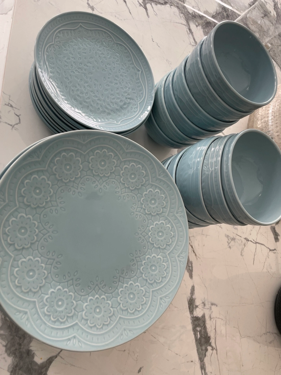 Elegant light blue dinnerware set. Includes plates and bowls. Lovely embossed design. Perfect for everyday use or special occasions.