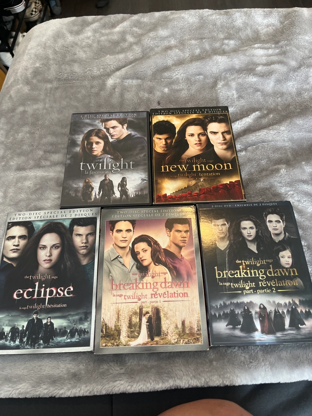 102Five-DVD set. Includes Twilight, New Moon, Eclipse, Breaking Dawn Part 1, and Breaking Dawn Part 2. Two-disc special editions. French and English languages.