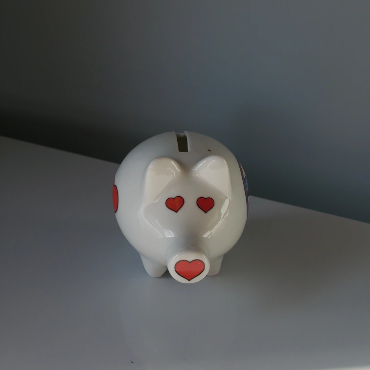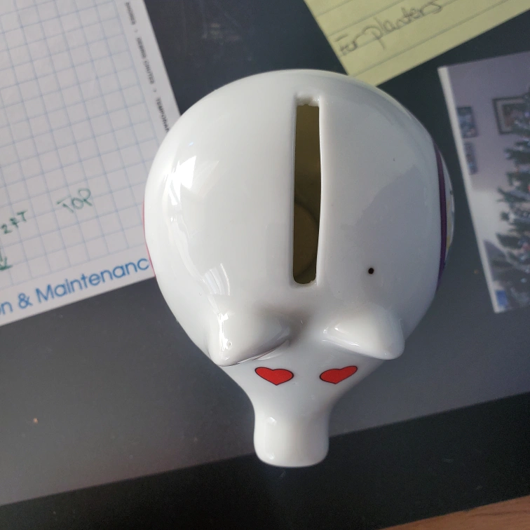 Adorable ceramic piggy bank. Features a hummingbird and flower design. Colorado label. Red hearts for eyes and snout. Small collectible. Has a mark on the top and small pock marks from manufacturer. the feet have some marks. Located northside.