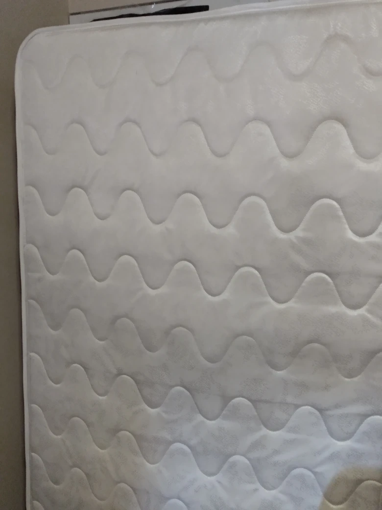 8Black metal single bed frame. Off-white double mattress. Wave-patterned quilted top. Used, good condition.