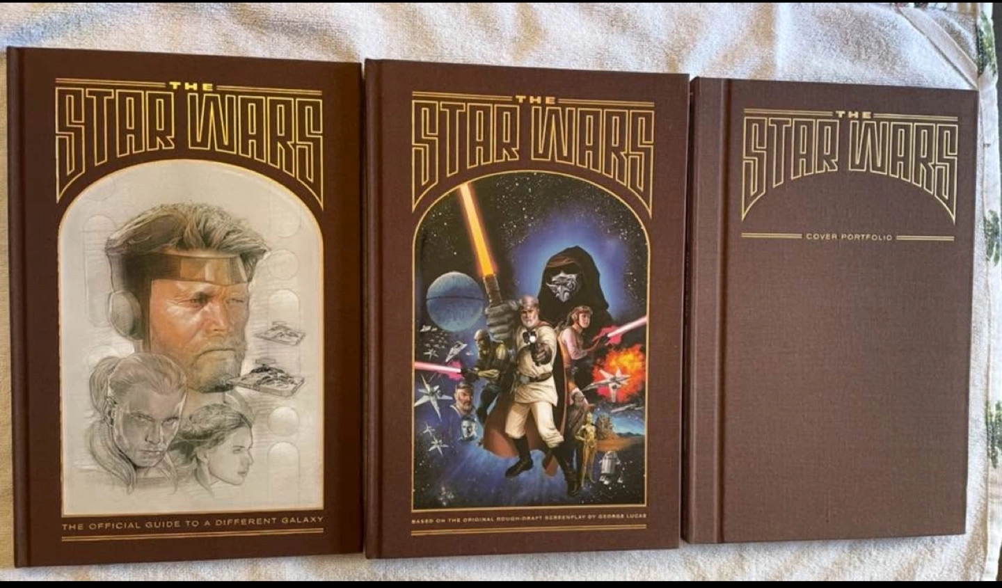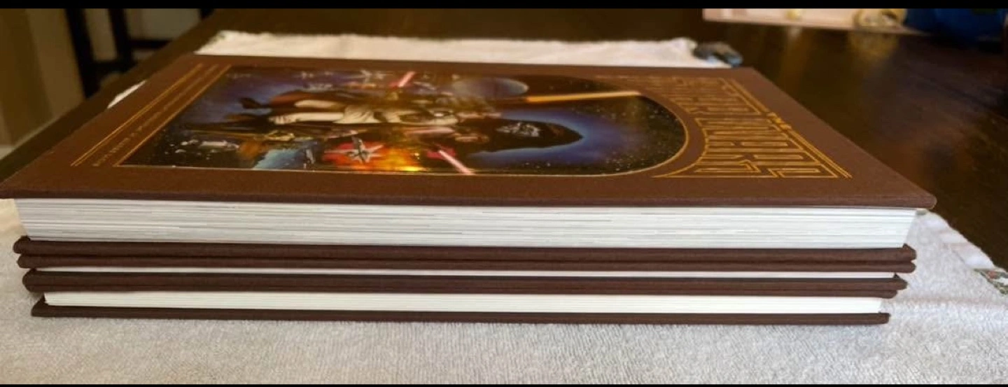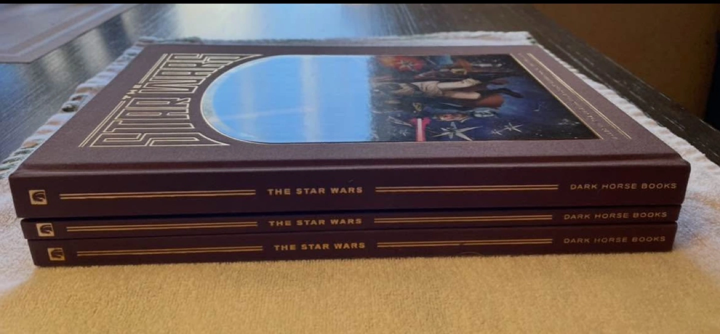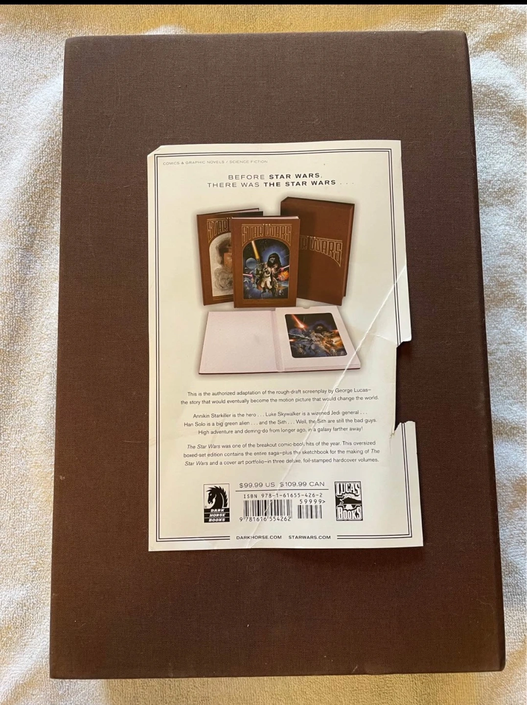 Really cool relic for any die hard Star Wars collector. See what could have been, in a deluxe package! Deluxe edition contains Issues #0-8 of The Star Wars saga, a portfolio of the comic covers, and an introduction by writer Jonathan Rinzler all collected in three deluxe, foil-stamped, hardcover volumes and enclosed in a clothbound clamshell box measuring 9"x13.5"x3" Clamshell box has a bit of wear and tear shown in the 3rd picture but books are in perfect condition as they've never been opened.