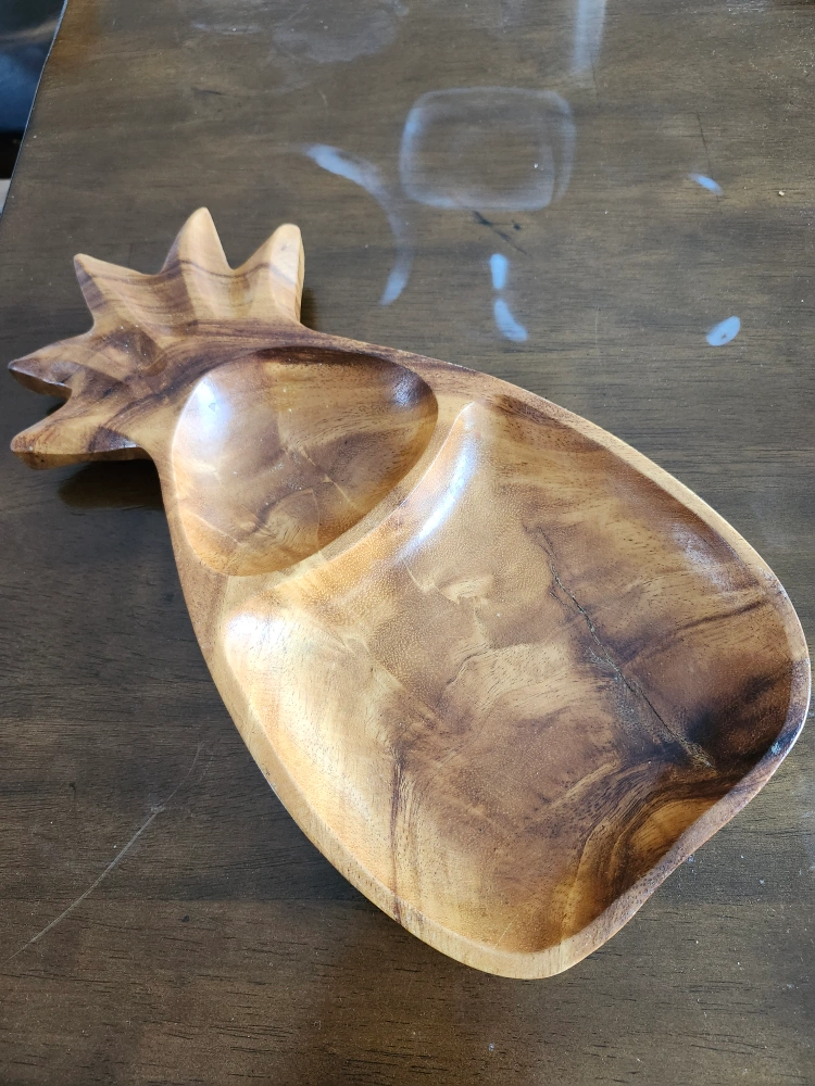143Hand-crafted wooden serving tray. Shaped like a pineapple. Two separate sections. Acacia wood. Made in the Philippines.